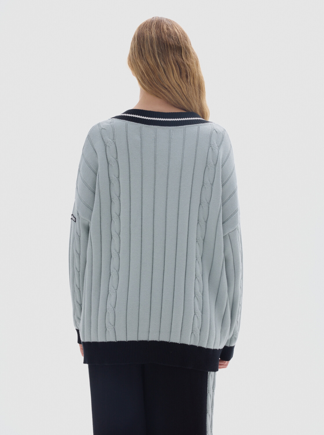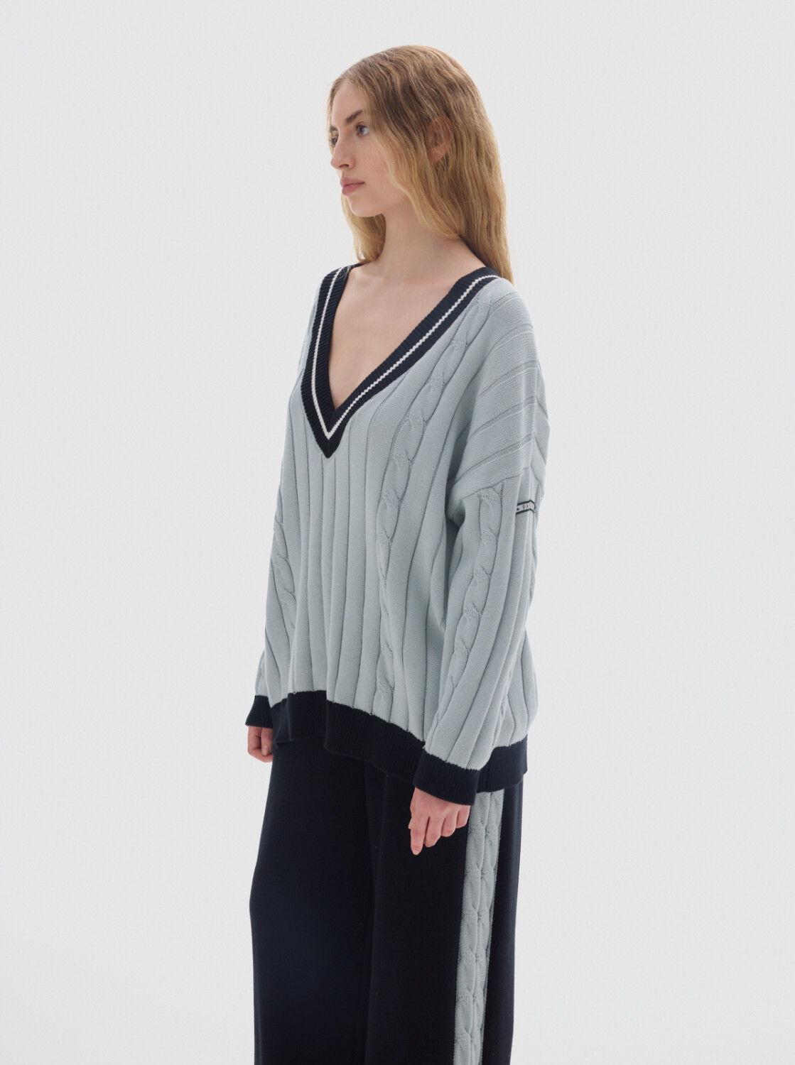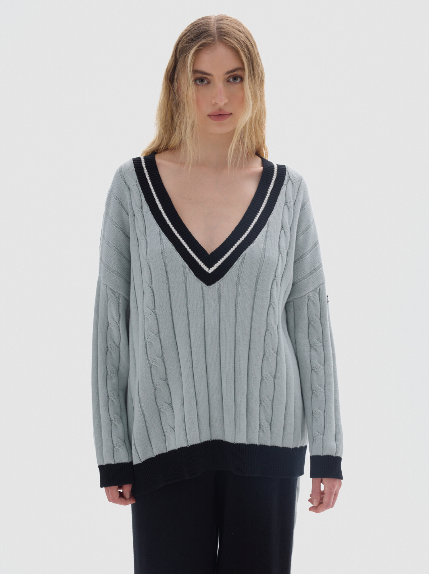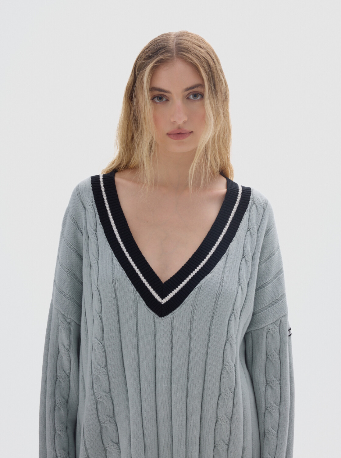 Buzo tejido oversized con cuello en V y mangas largas.