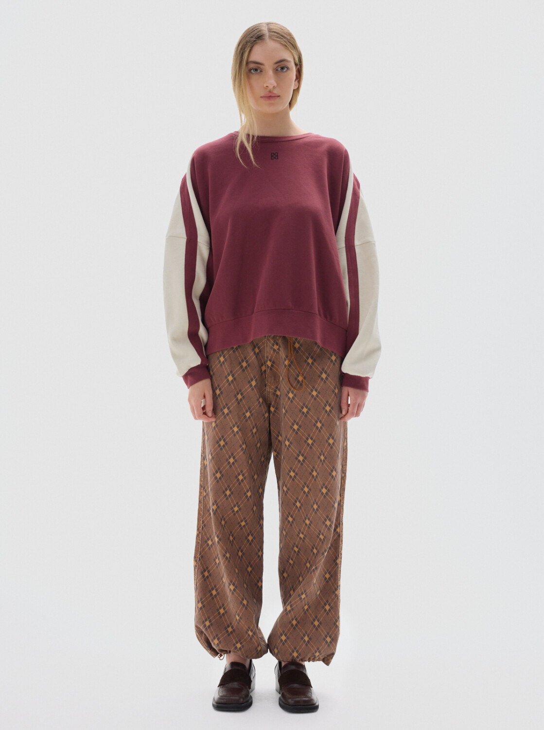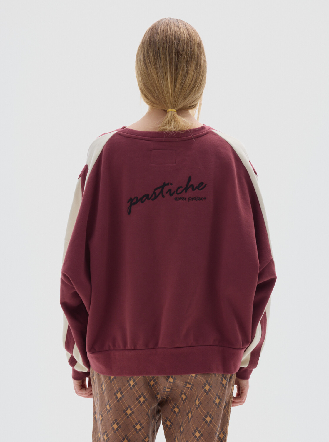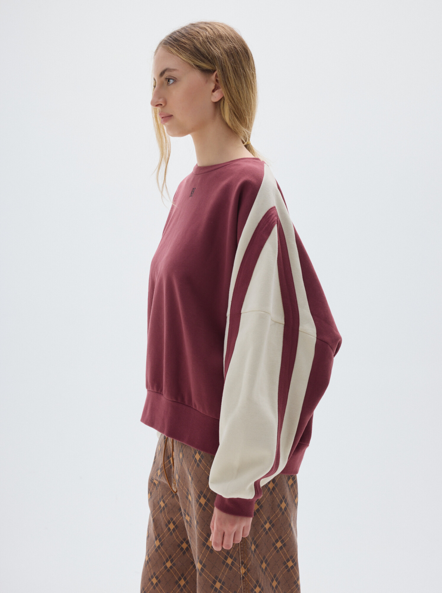Buzo de felpa suave con interior de friza, calce oversized y detalles laterales a contratono en mangas.