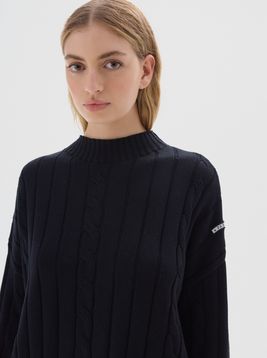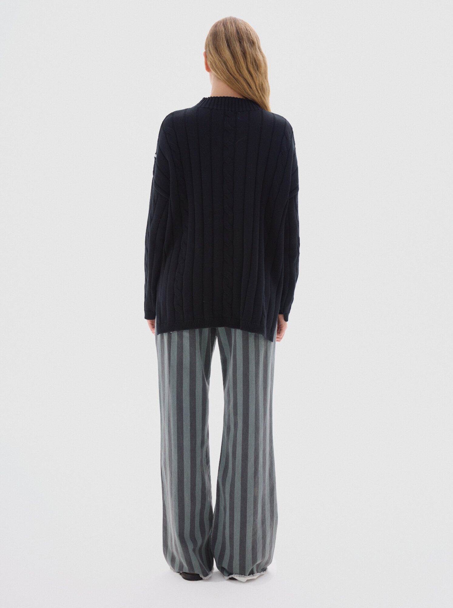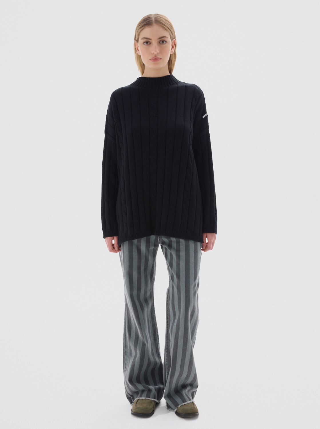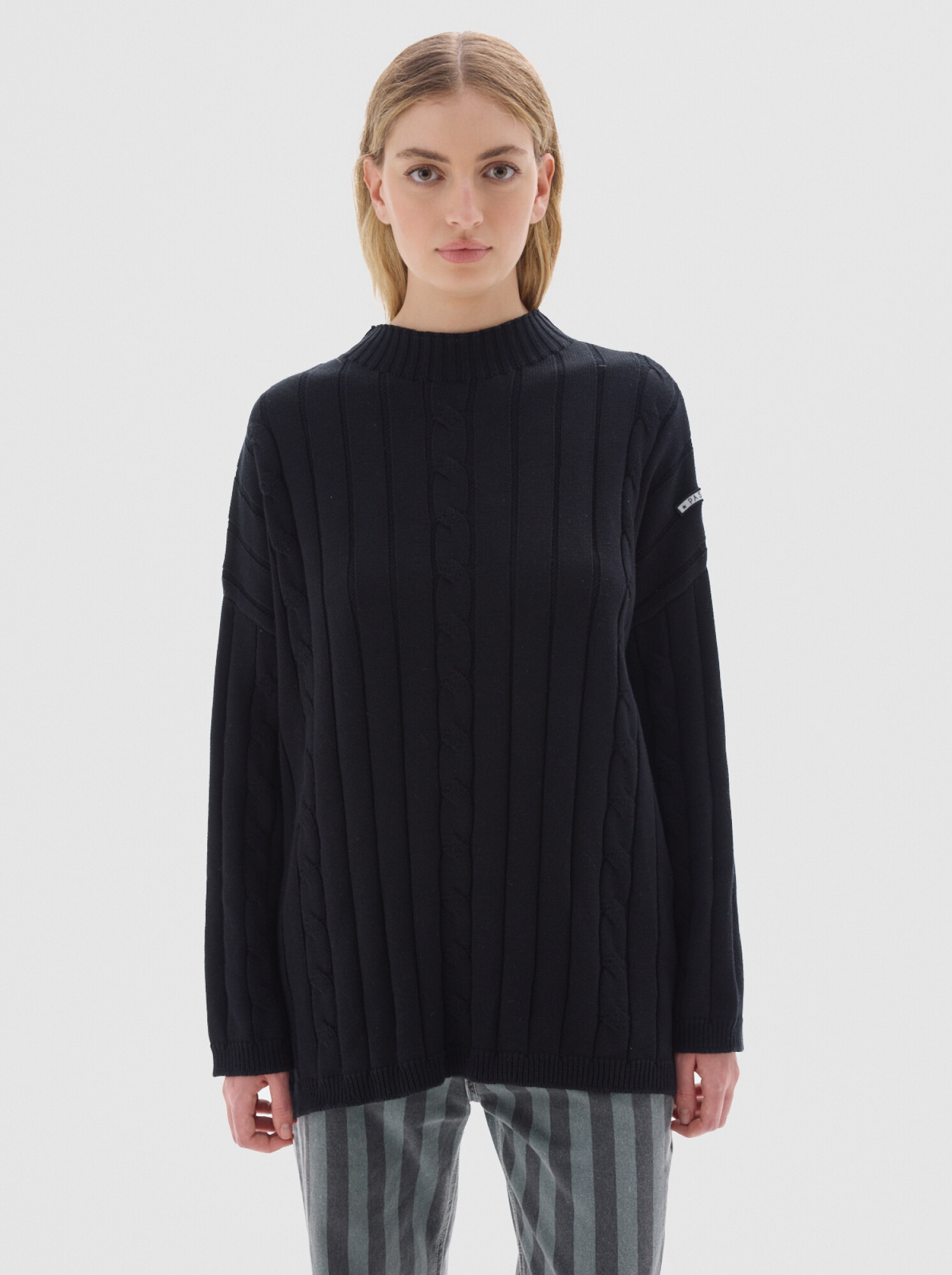 Cuello subido tipo polerita, oversized, largo con pequeños cortes a los costados.