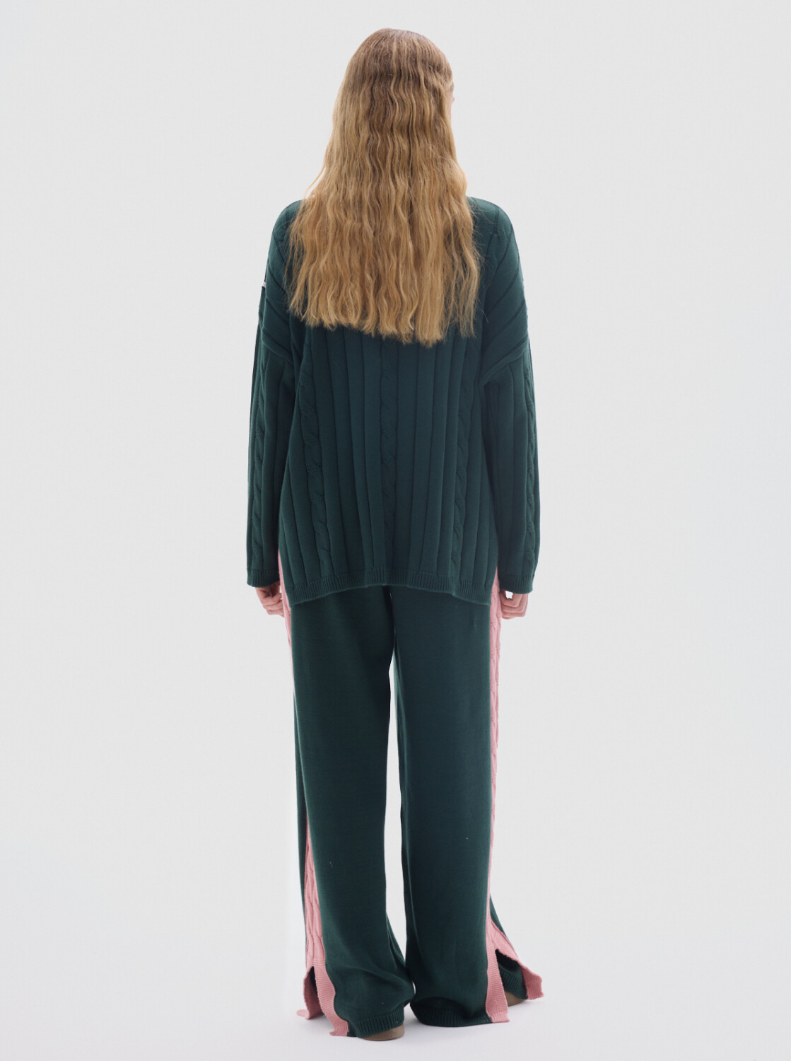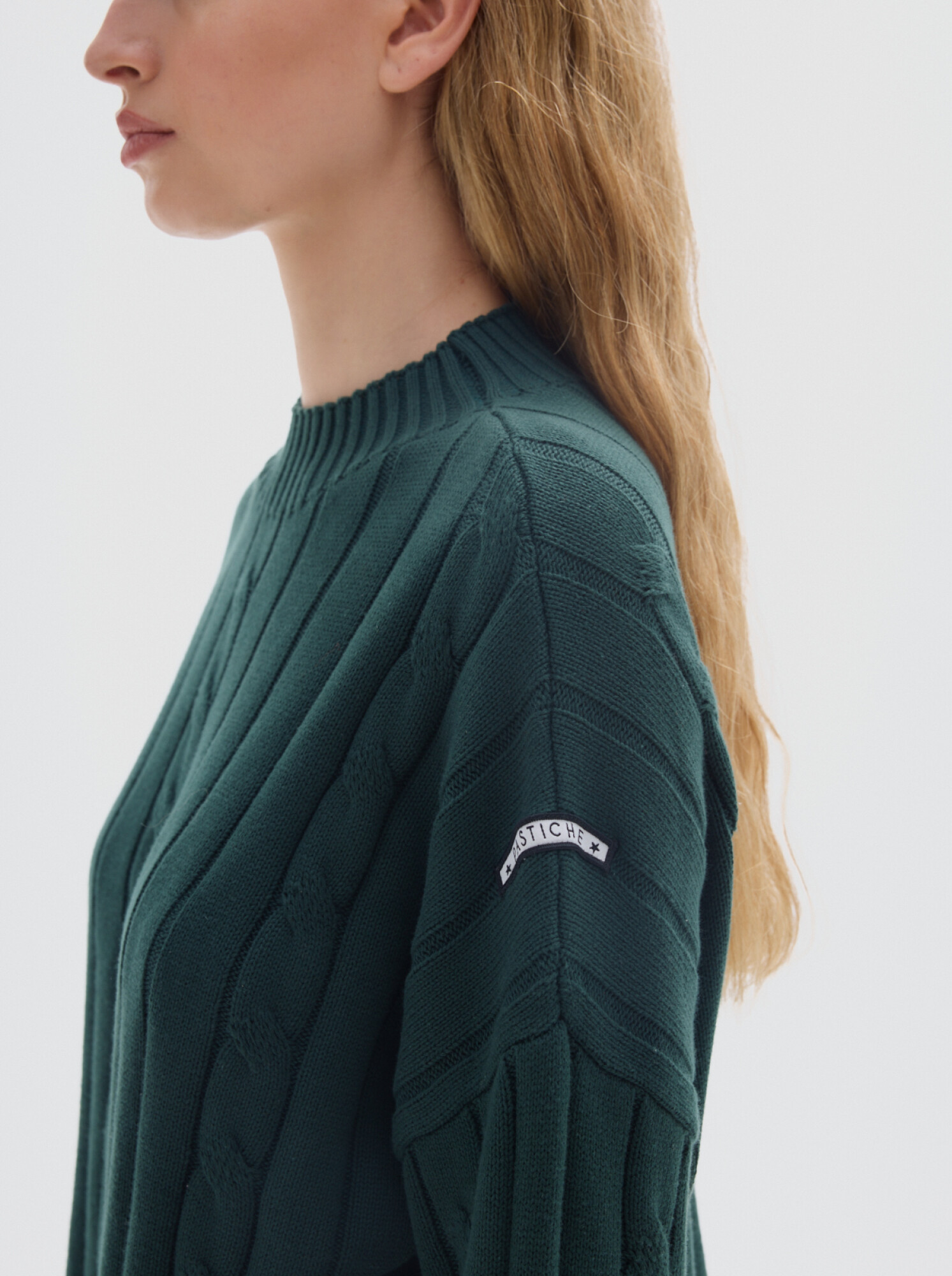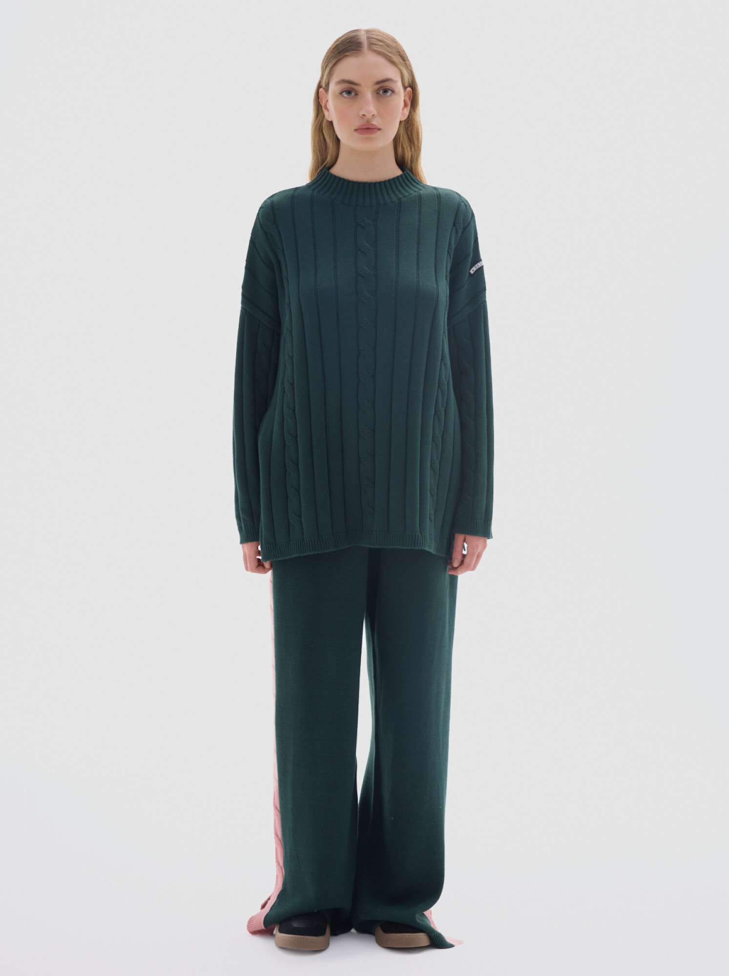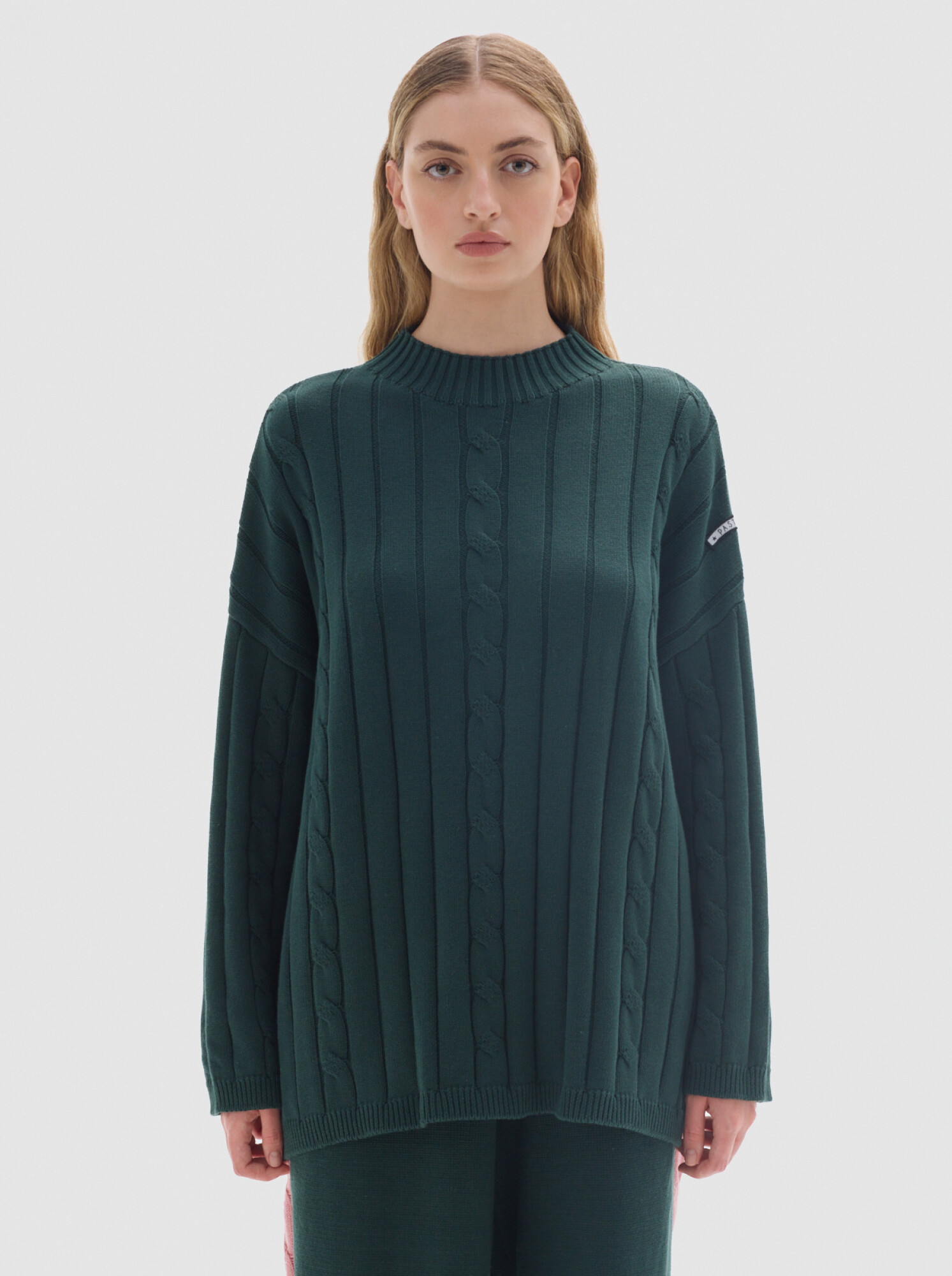 Cuello subido tipo polerita, oversized, largo con pequeños cortes a los costados.