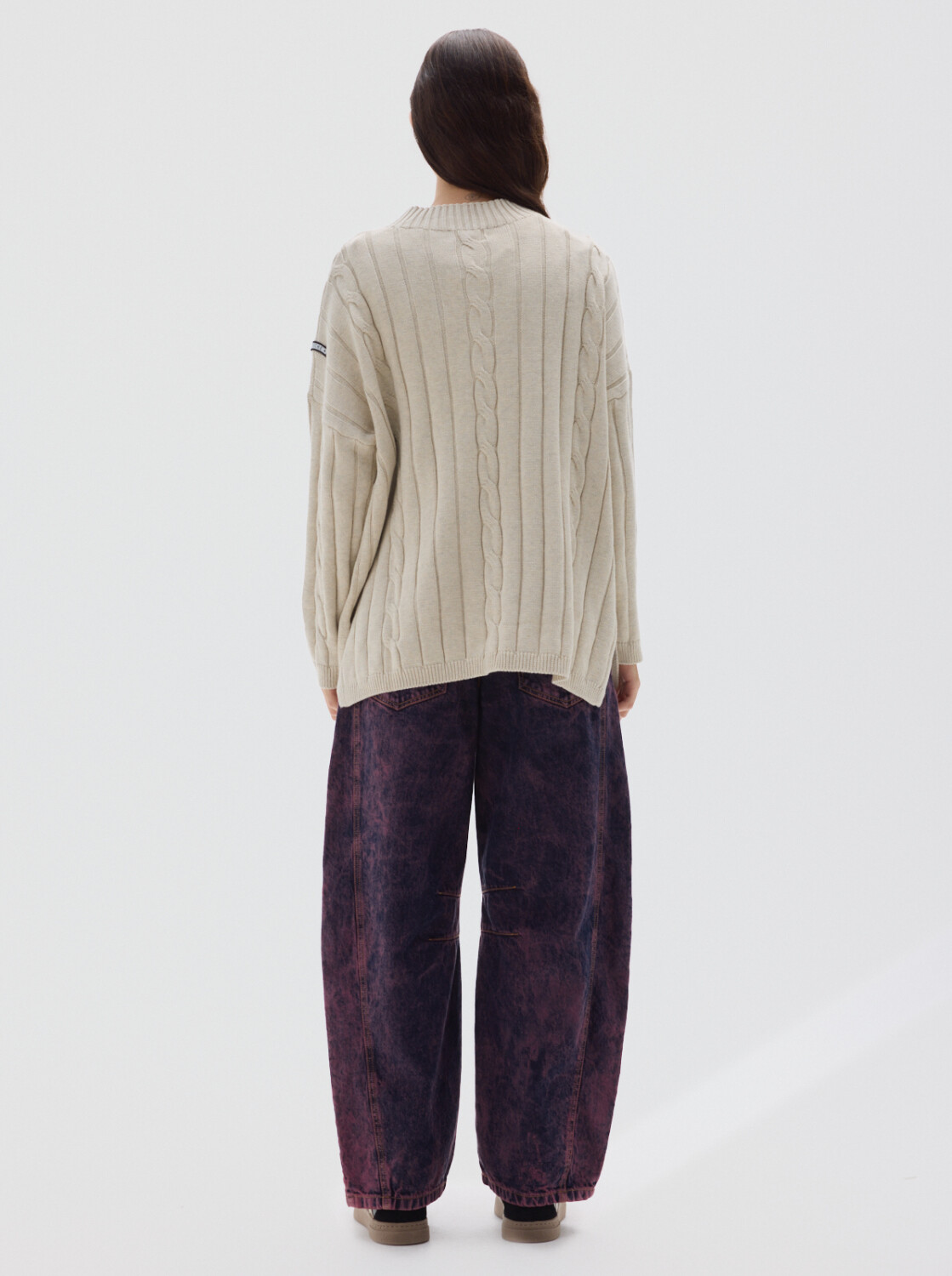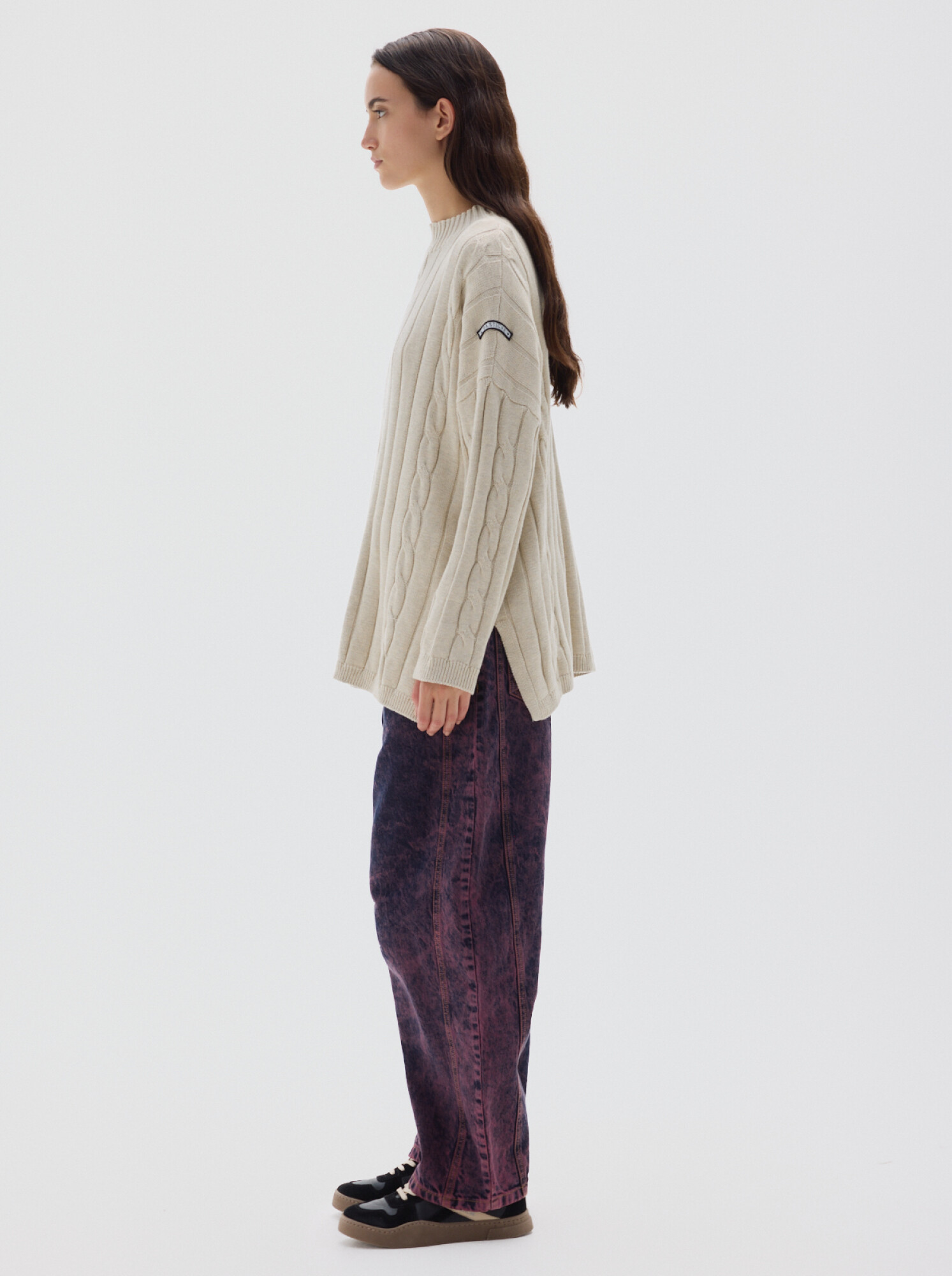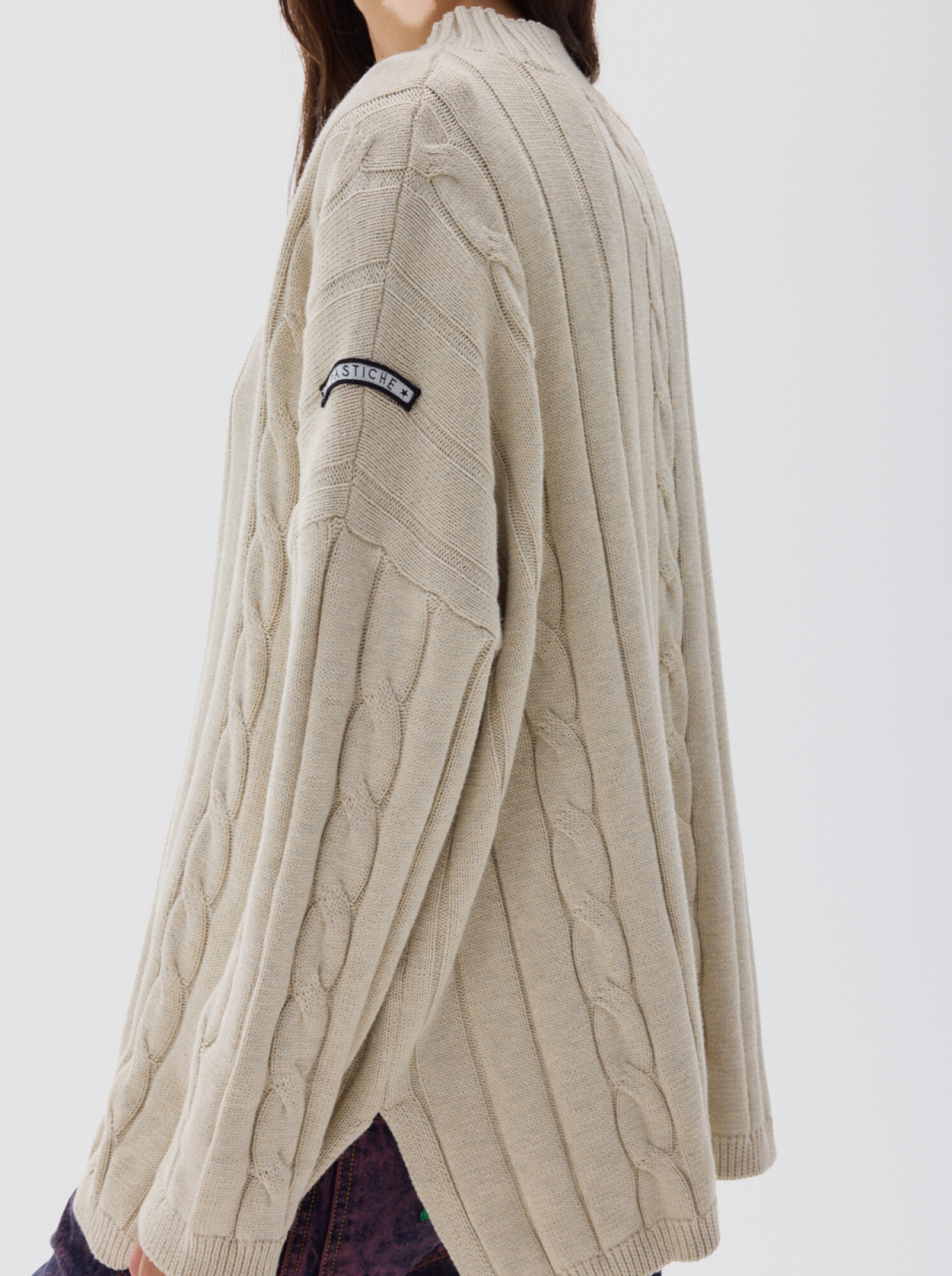 Cuello subido tipo polerita, oversized, largo con pequeños cortes a los costados.