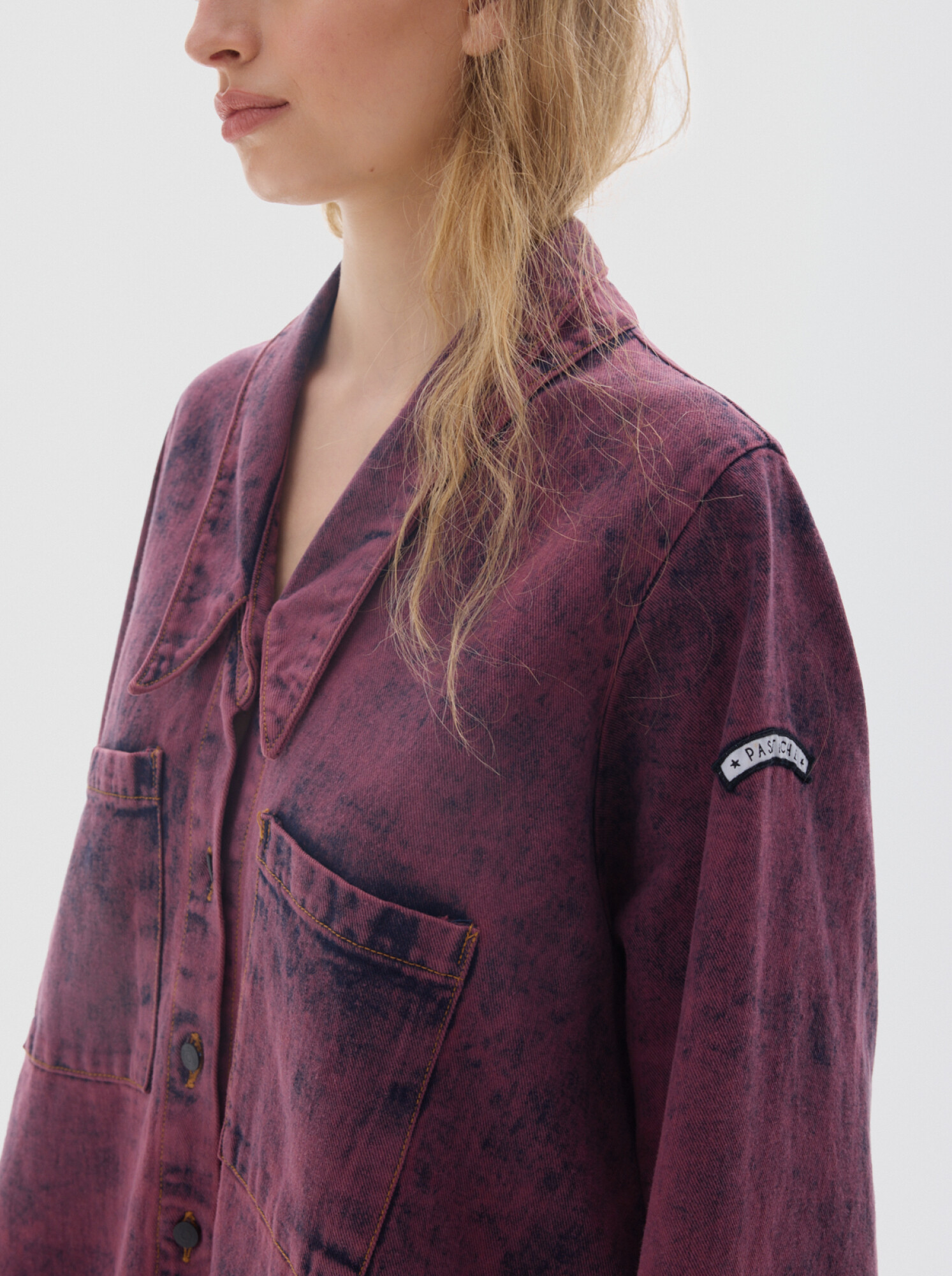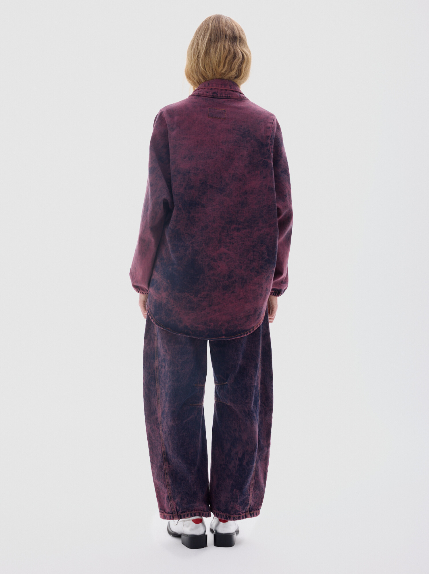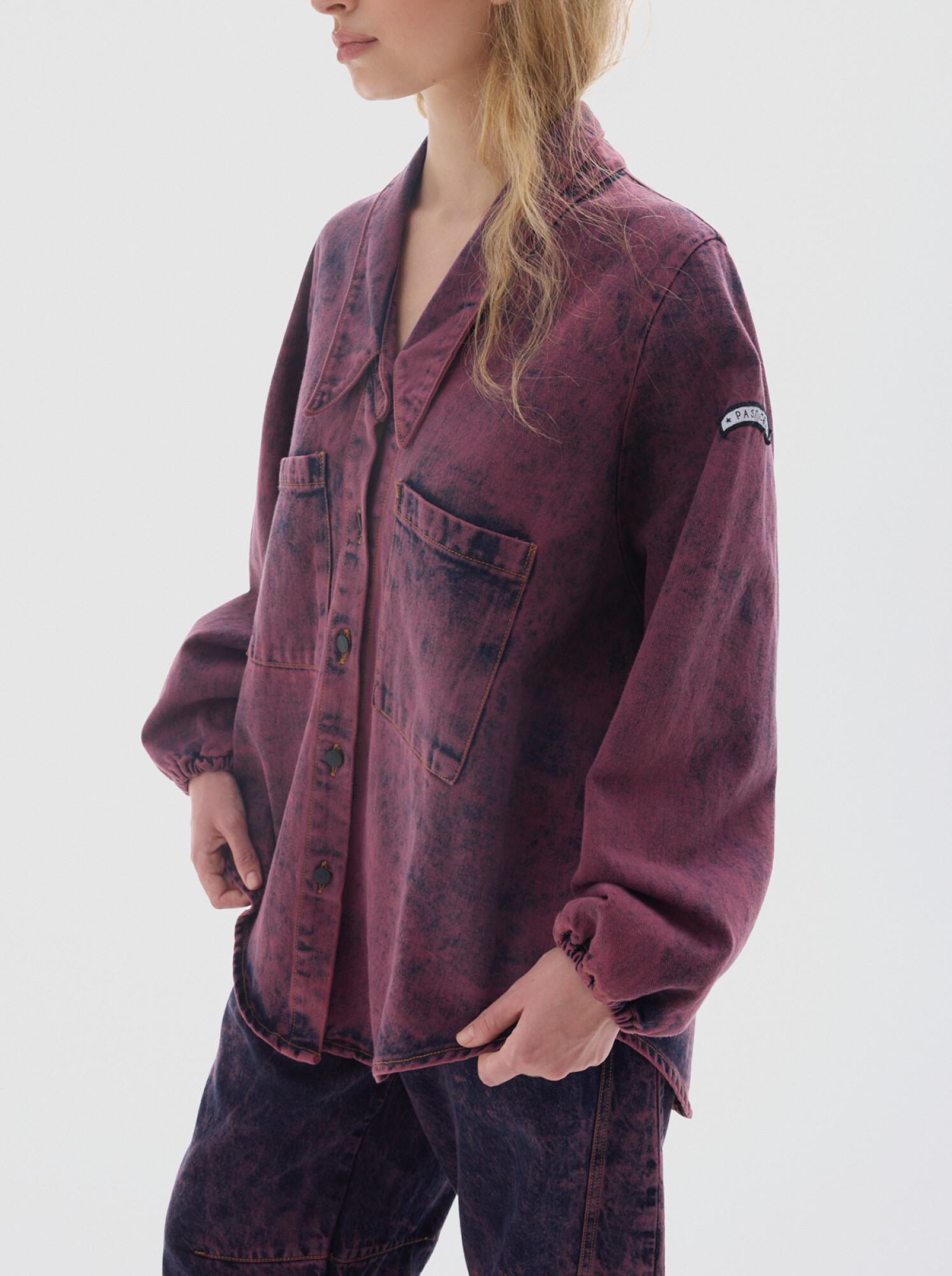 Camisa de denim oversized con escote en V, cuello camisero y mangas balloon.
