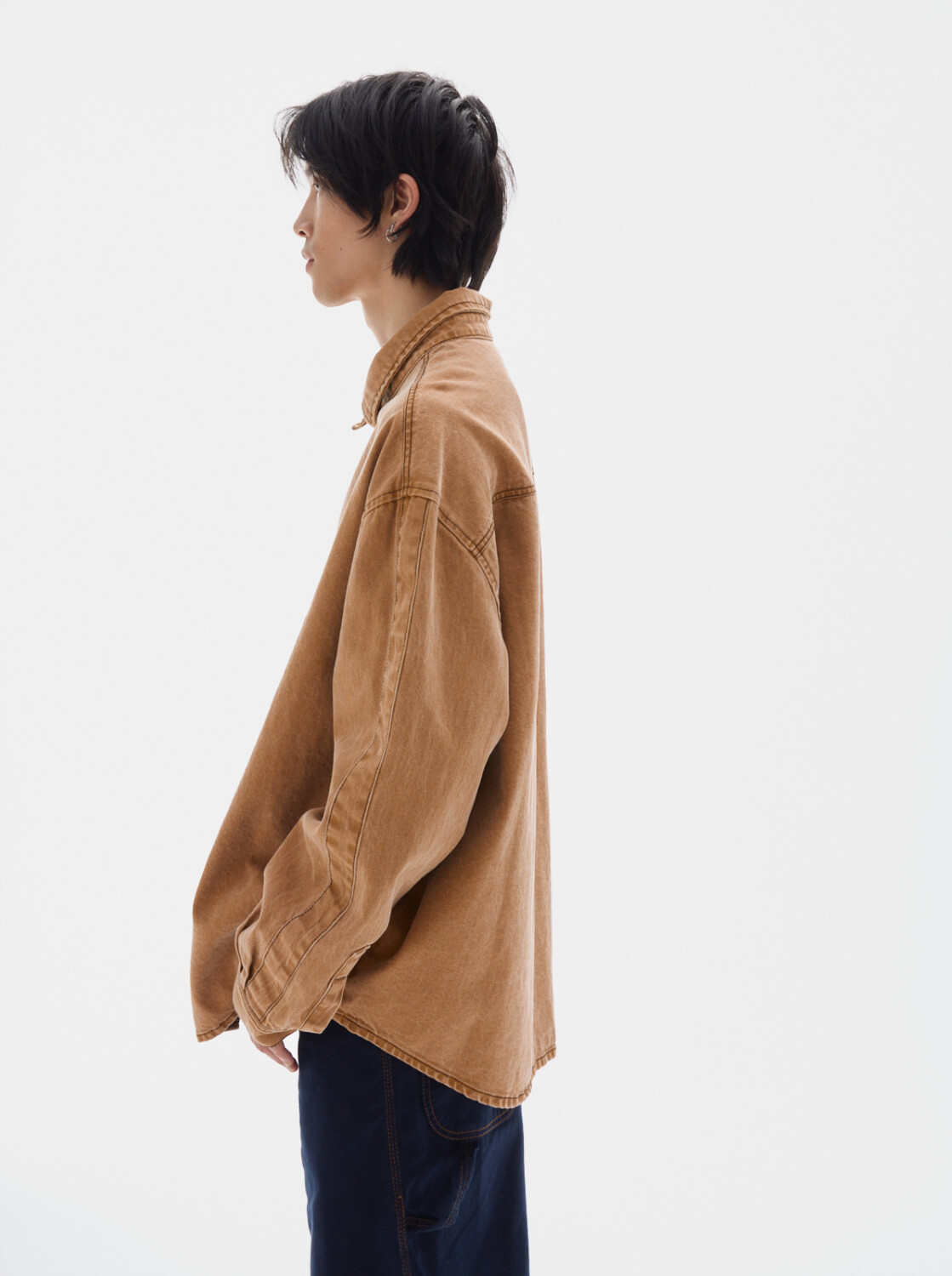 Camisa de denim de manga larga, con cuello clásico y botones negros.