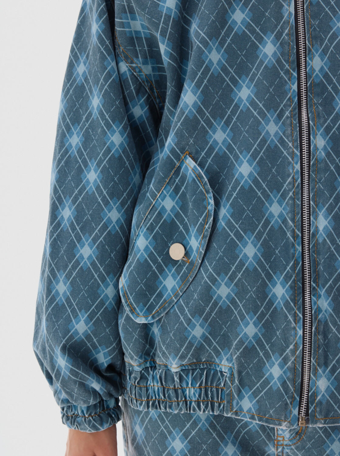 Campera fullprint denim bomber, con cierre metálico, bolsillos frontales.