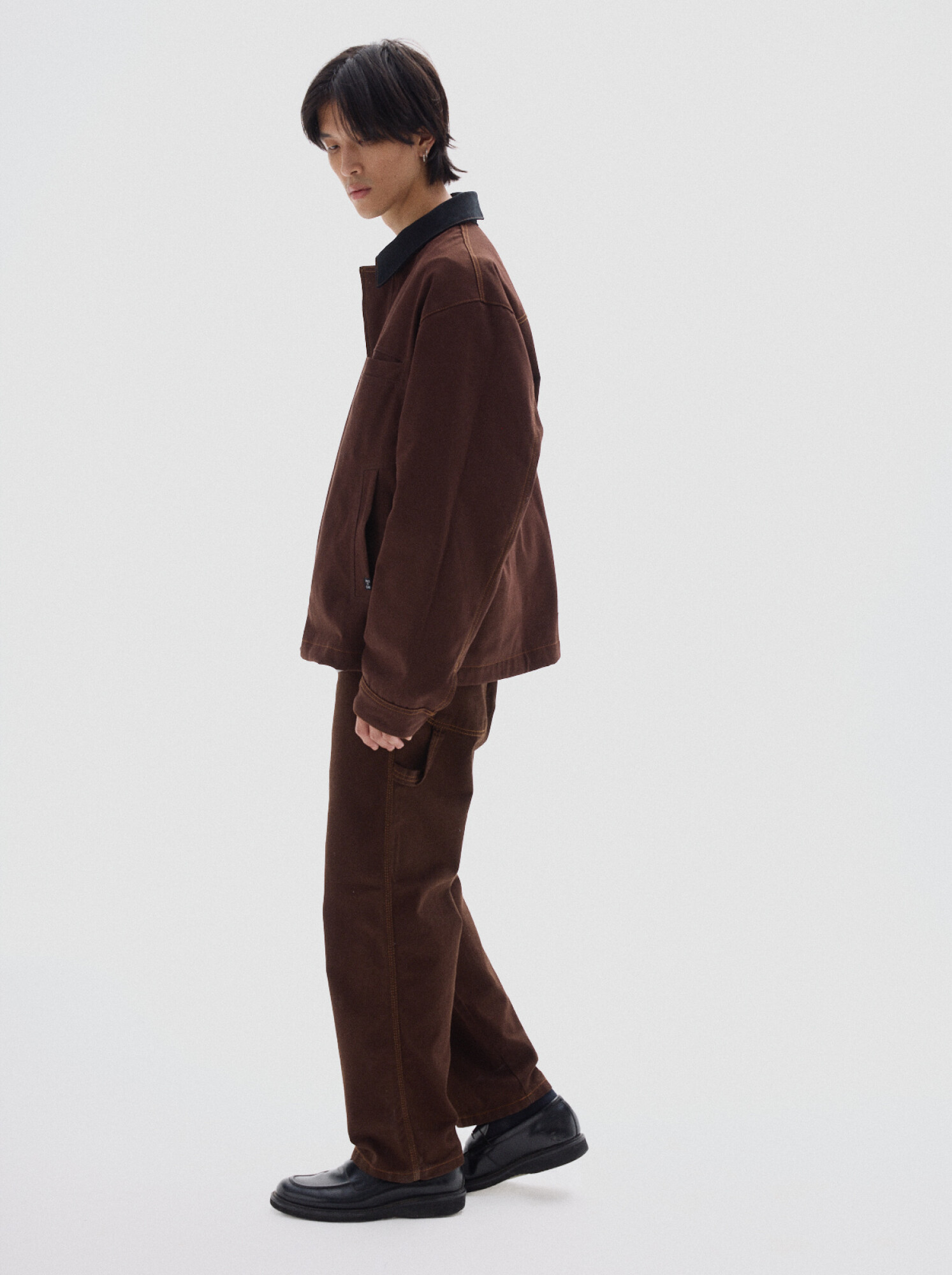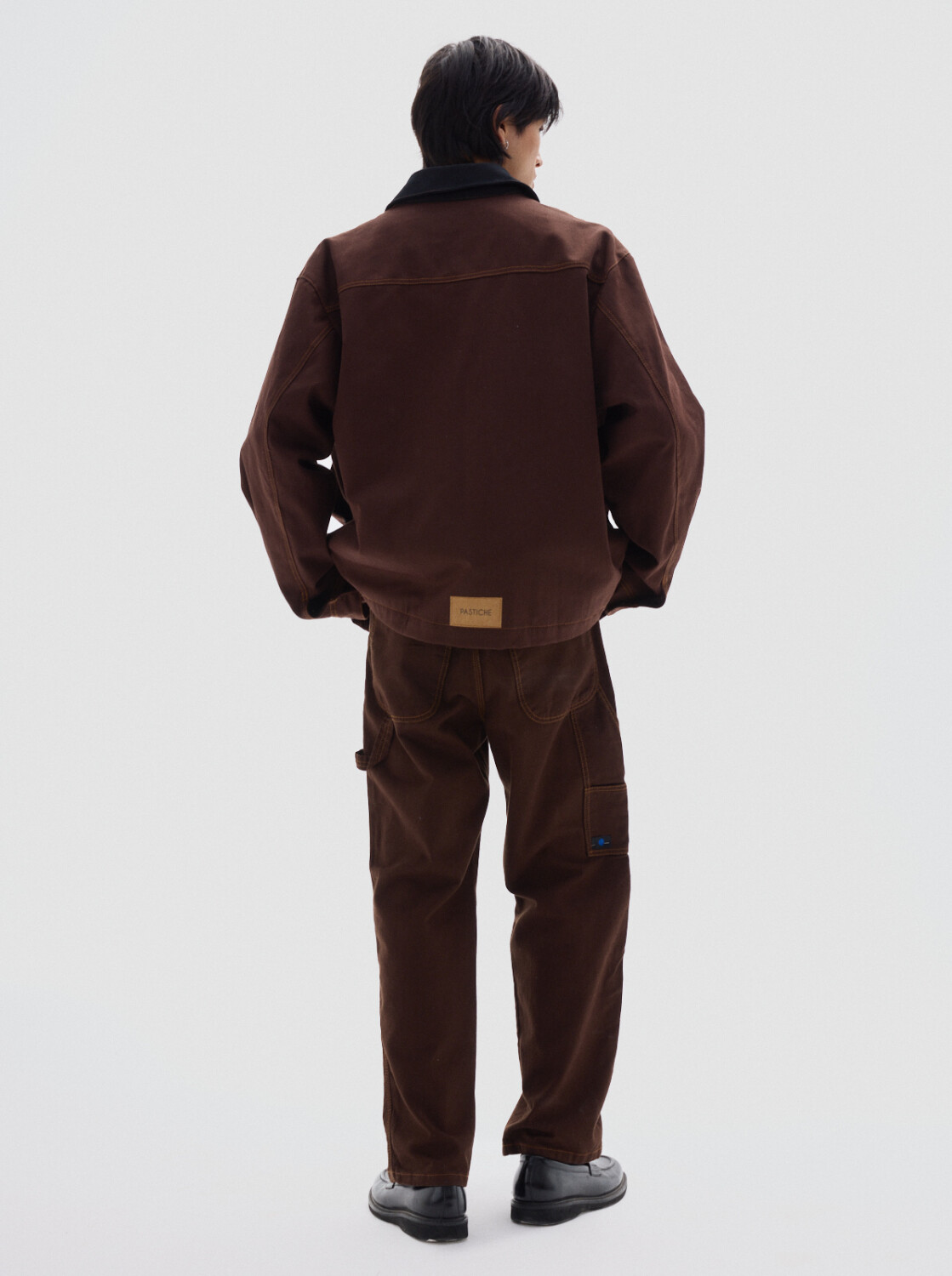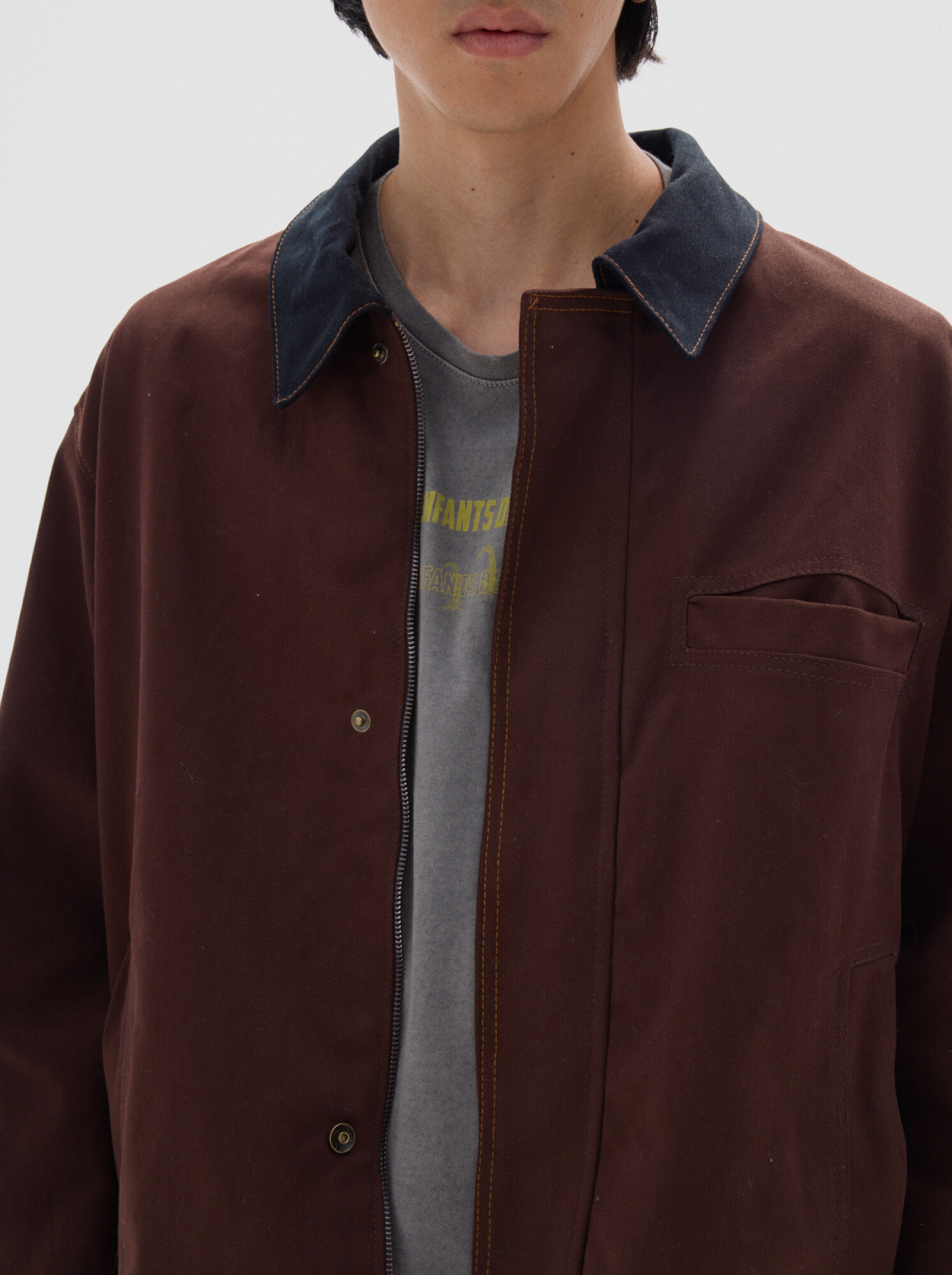 Campera de brim bull con bolsillos delanteros, cuello en contraste y cierre frontal metálico.
