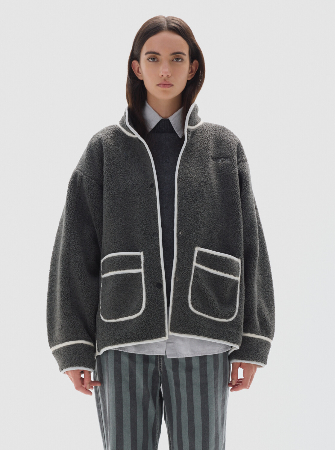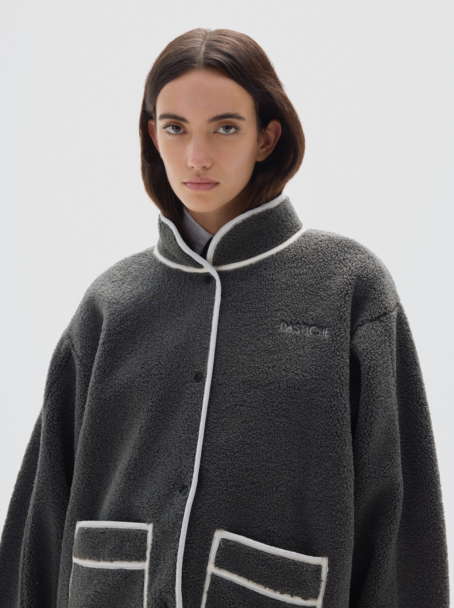 Cierre frontal con broches a presión, bolsillo tipo placket, manga larga, cuello alto y forro interior extra suave.