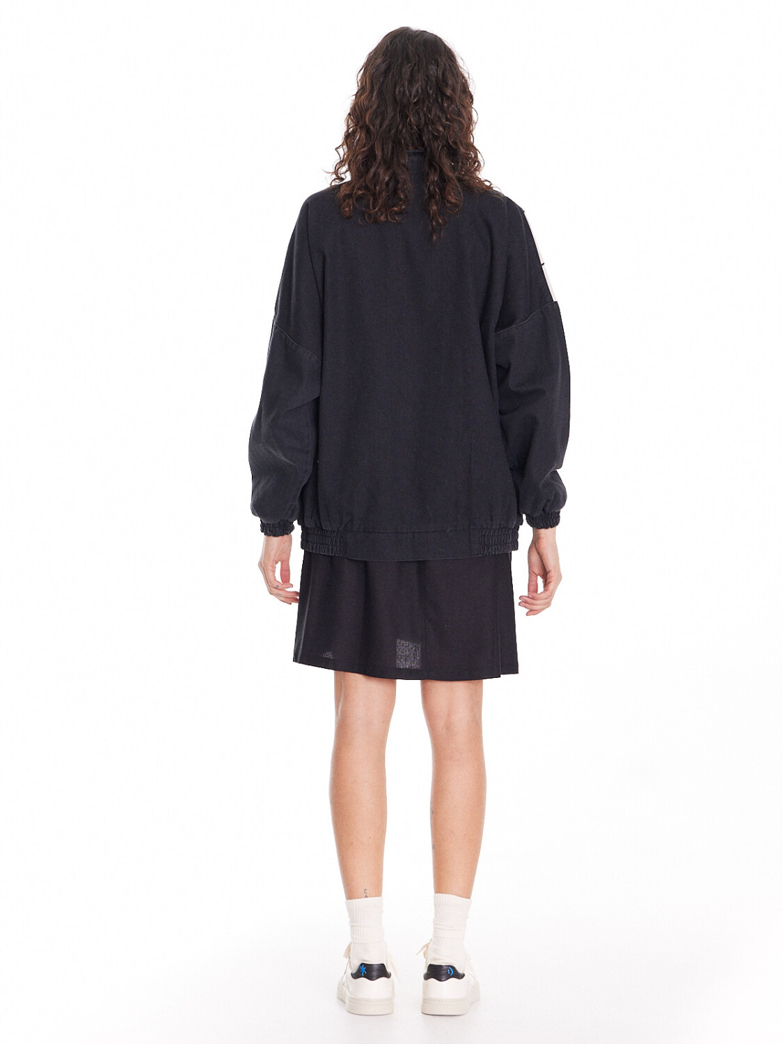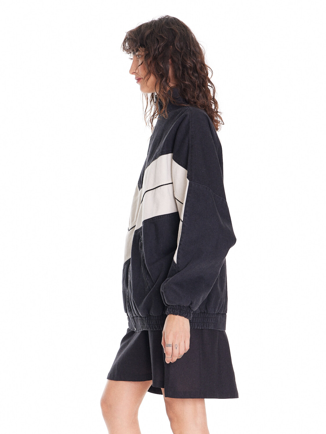 Corte oversized, con elástico en la cintura. Bolsillos al frente con cierre.