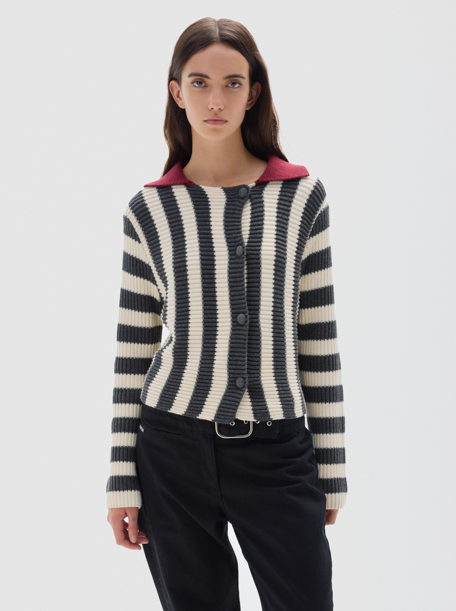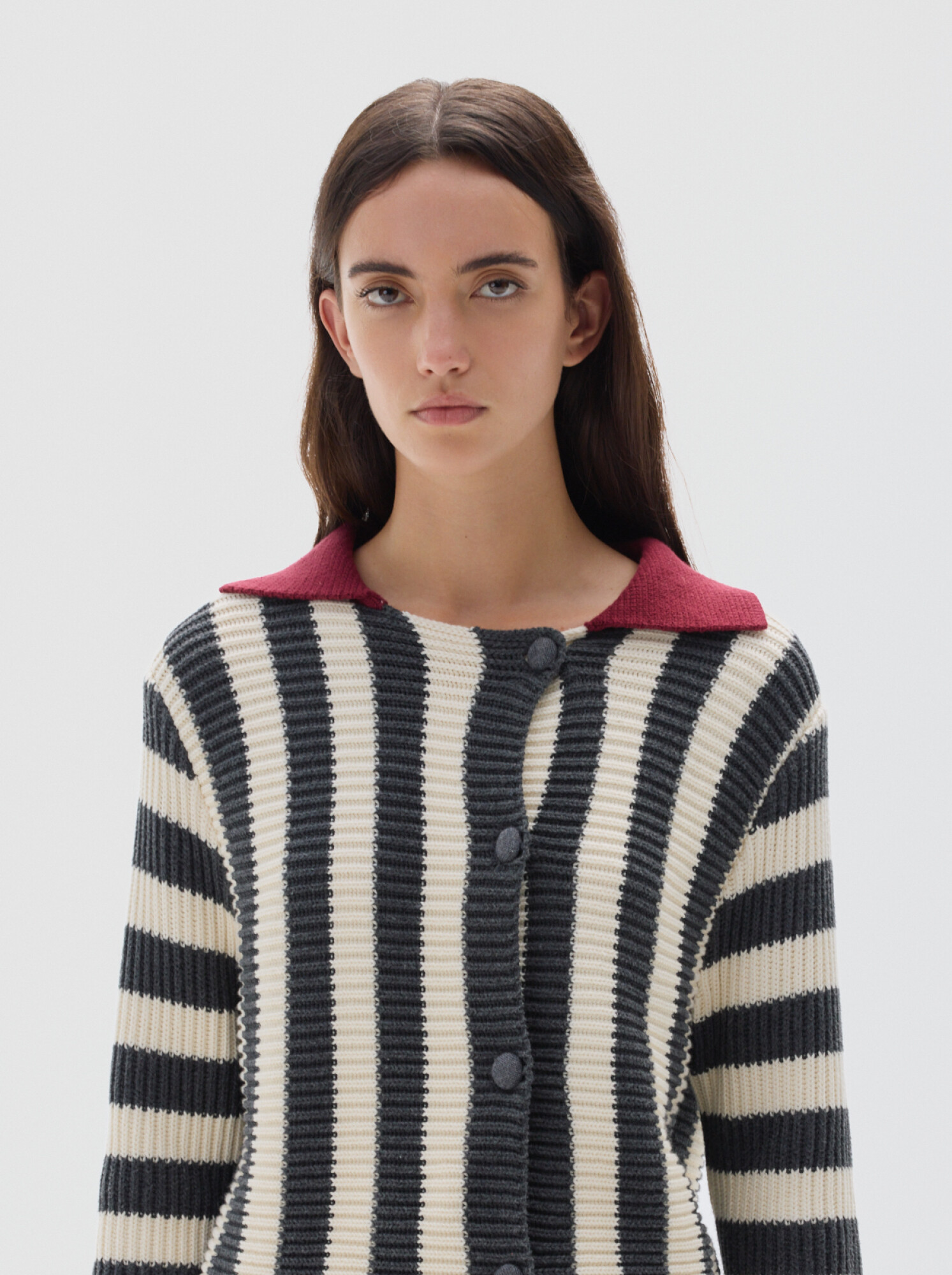 Cardigan de punto con rayas verticales, cuello polo a contratono y manga larga.