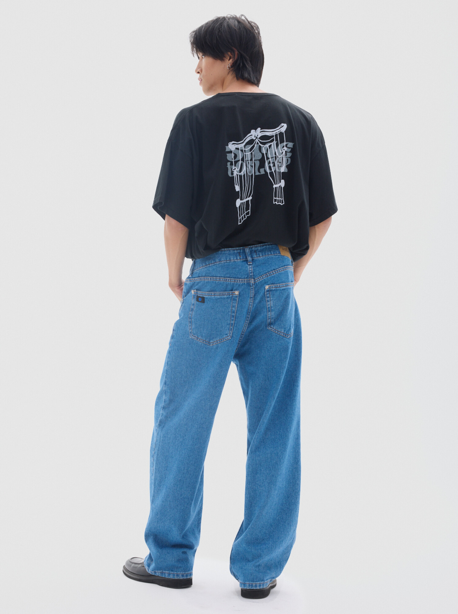 Jean denim classic de calce loose, con tiro medio y pierna ancha de caída recta.