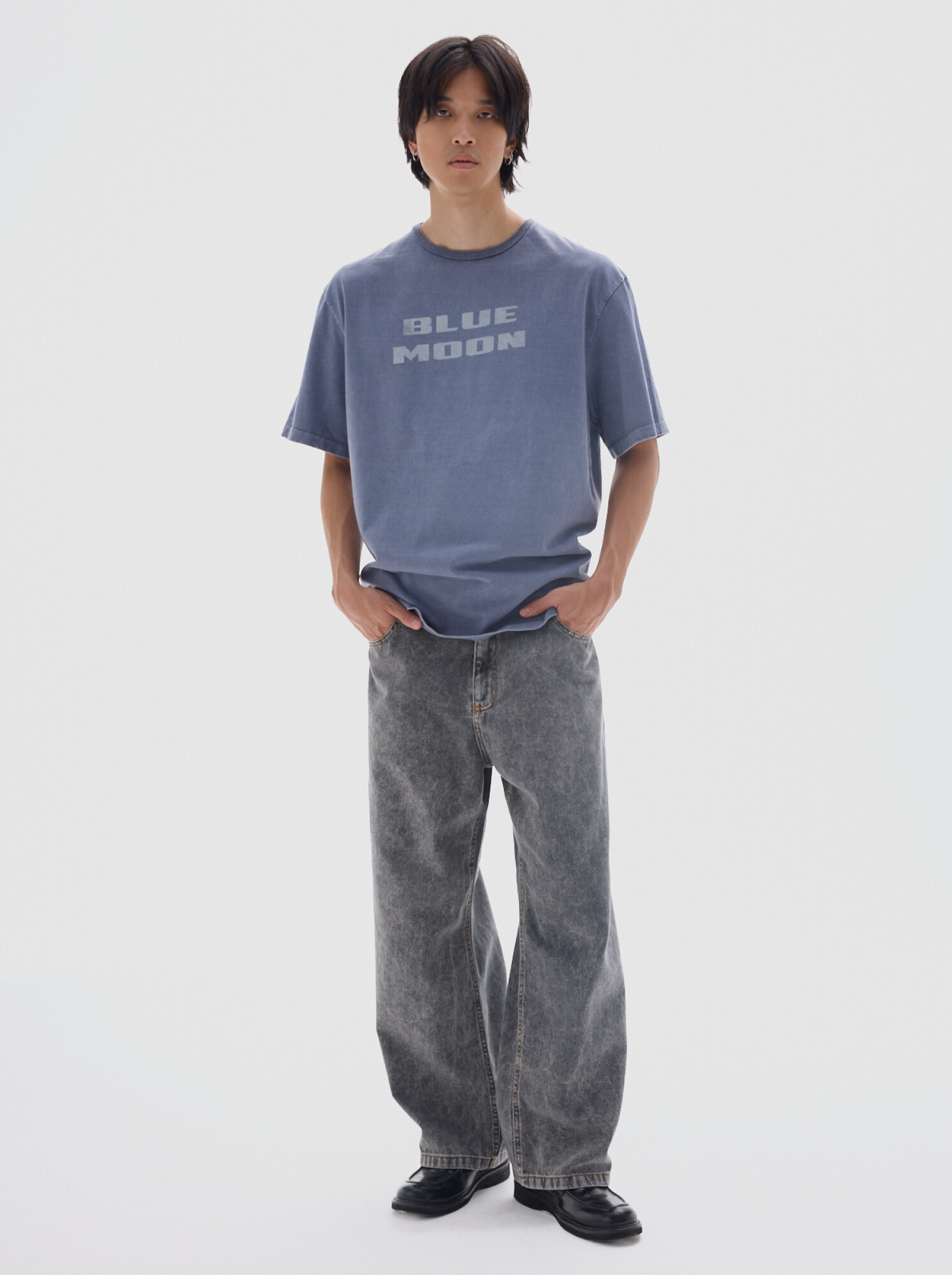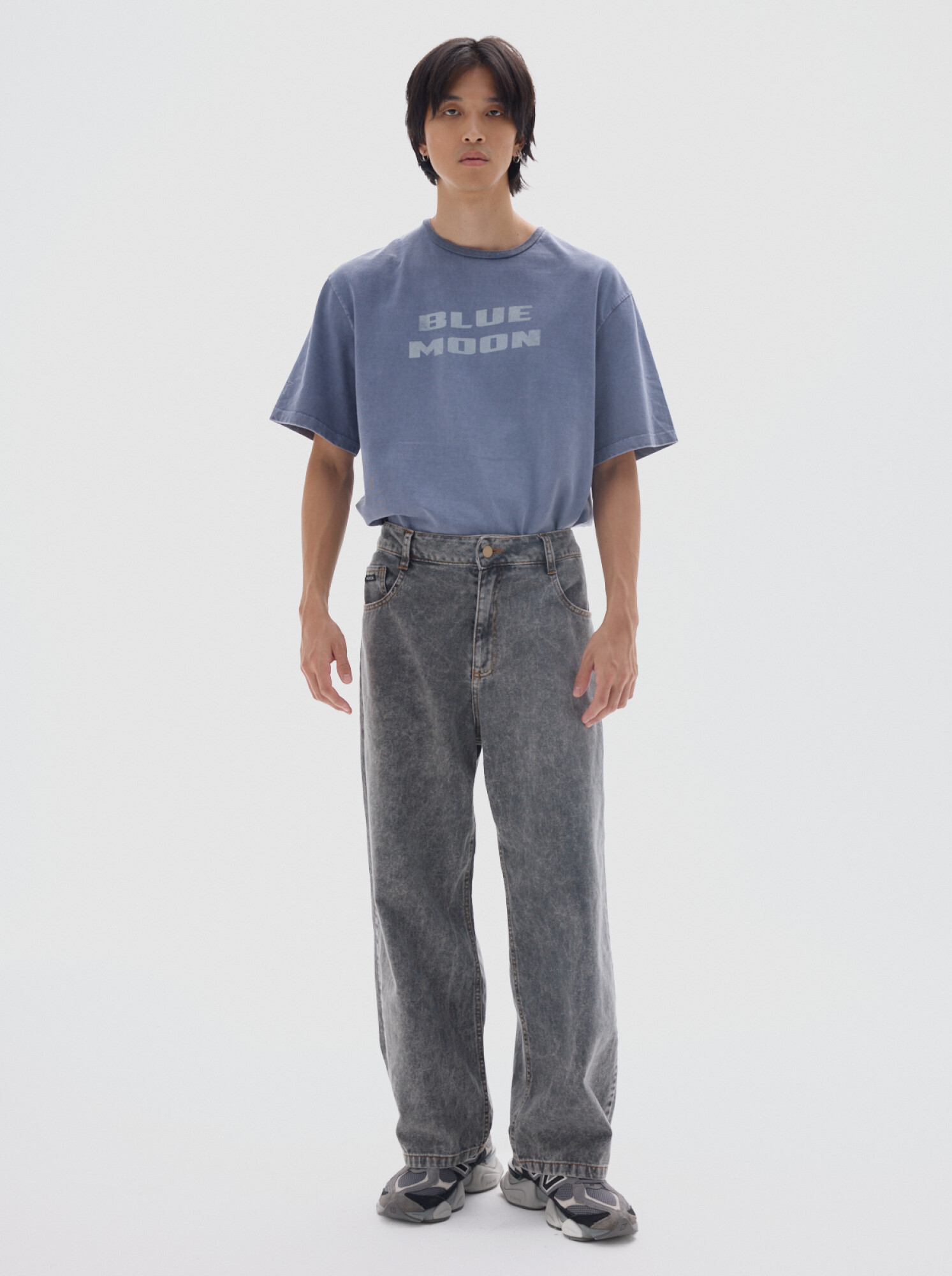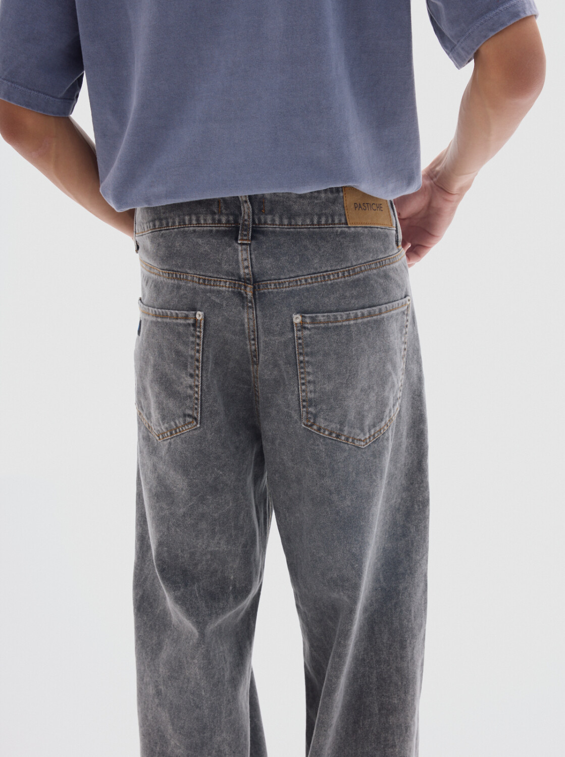 Jean soft stone de calce loose, con tiro medio y pierna ancha de caída recta.