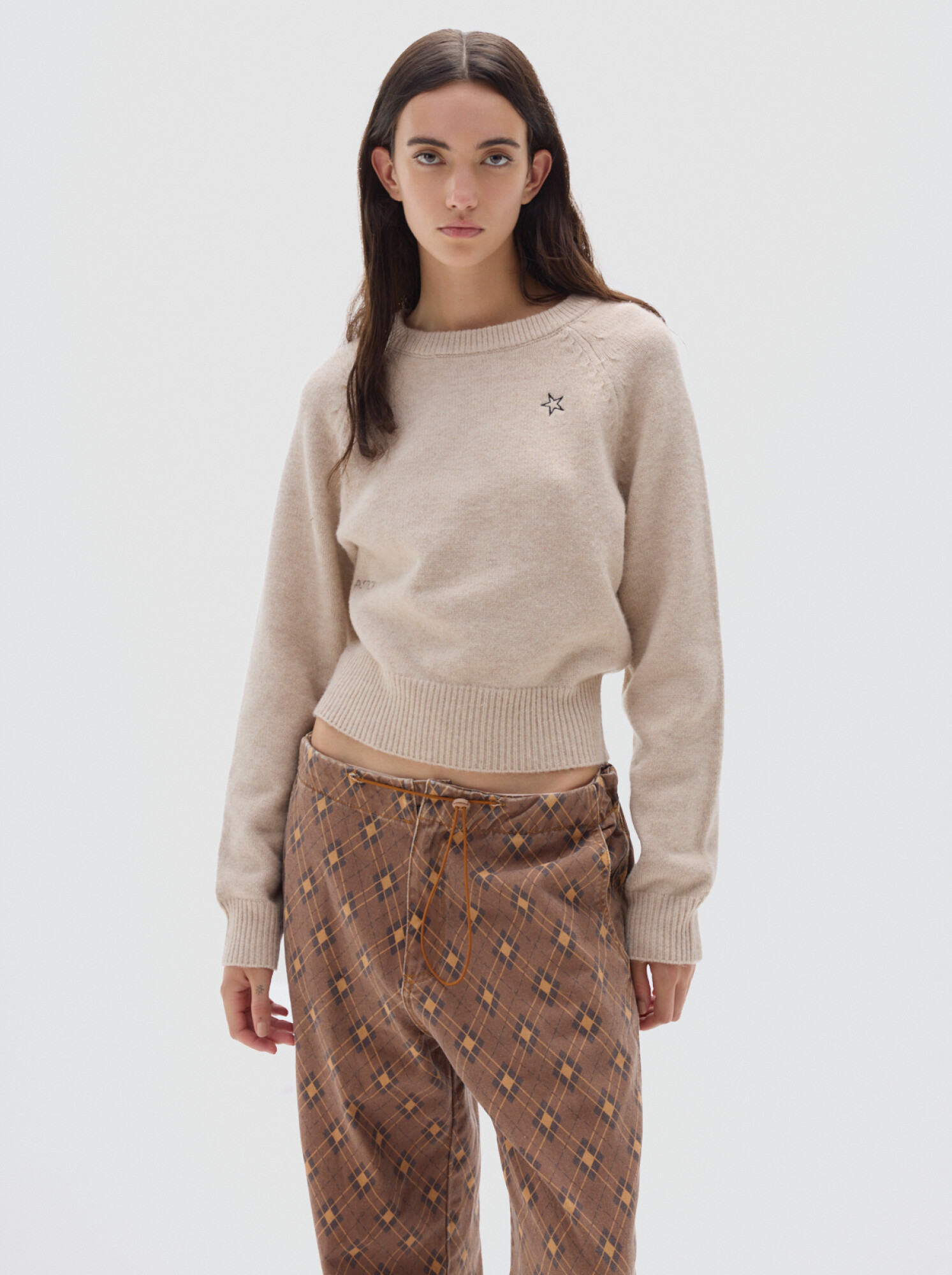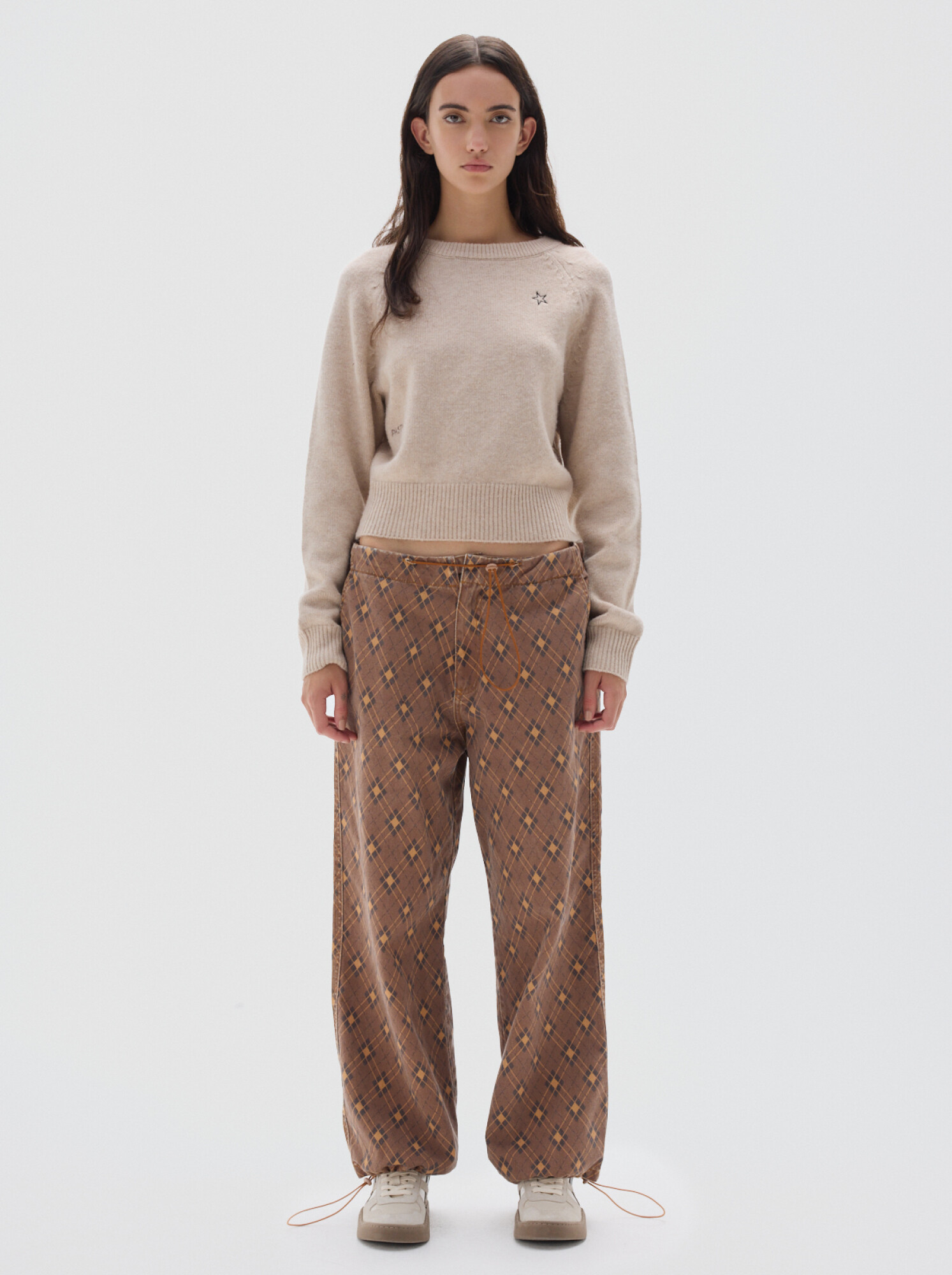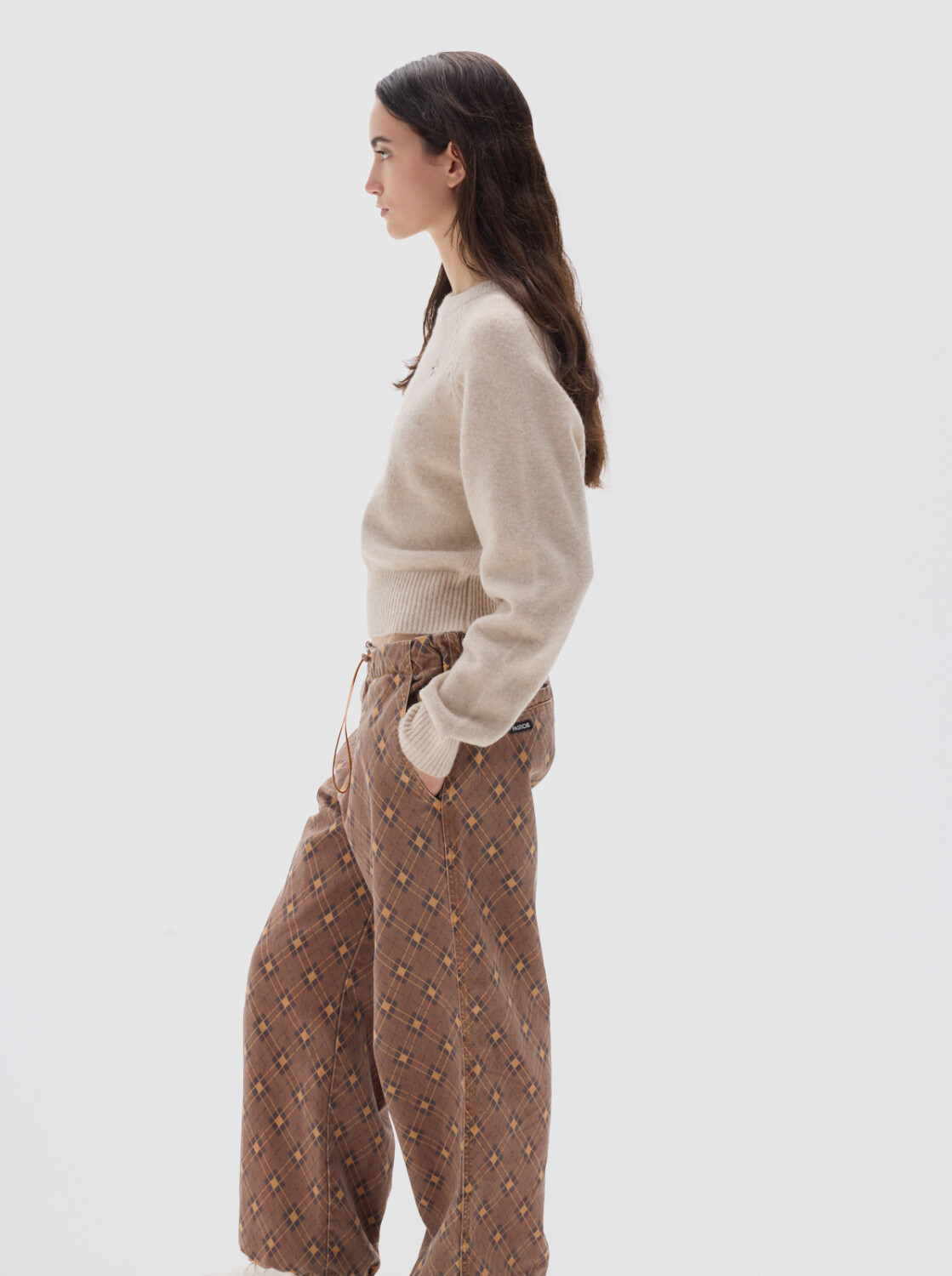 Jean parachute de denim print brown, con silueta amplia y cintura y bajo ajustables.