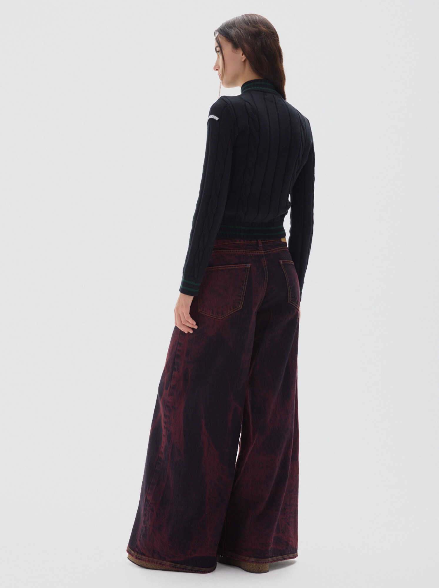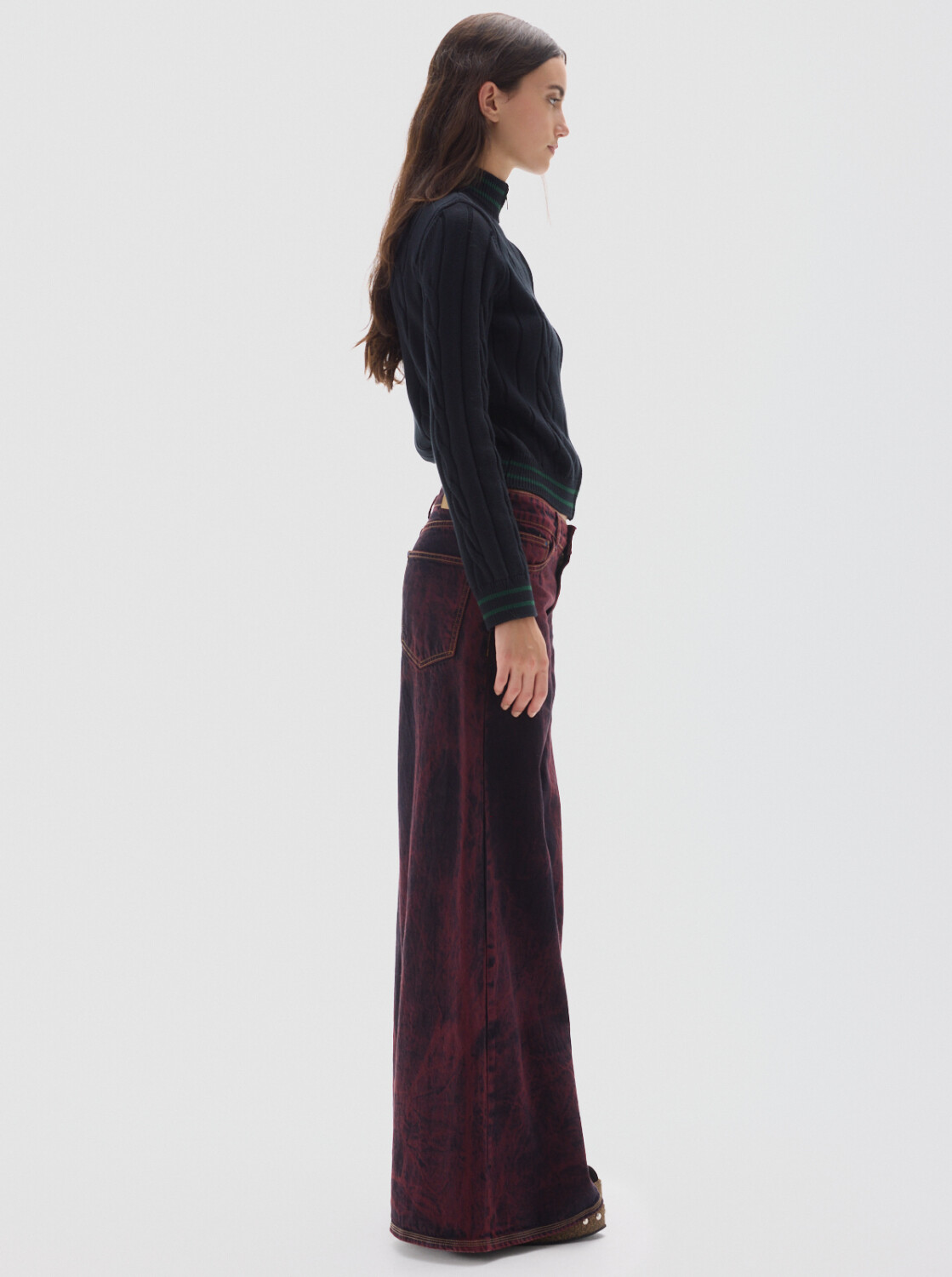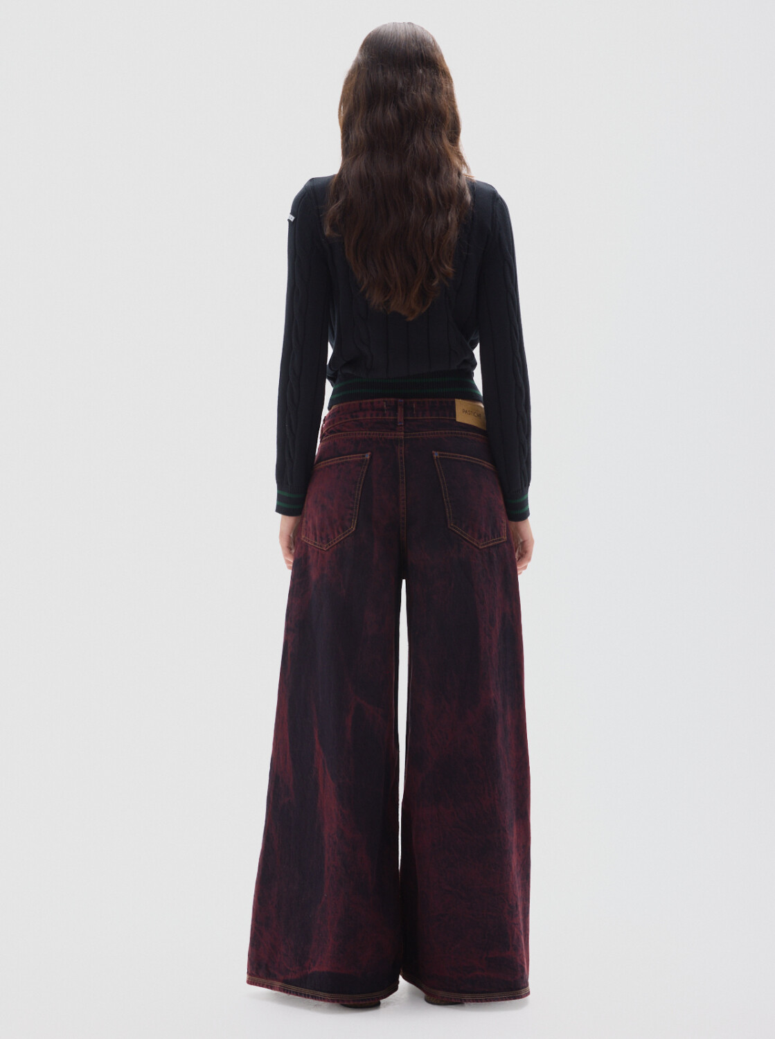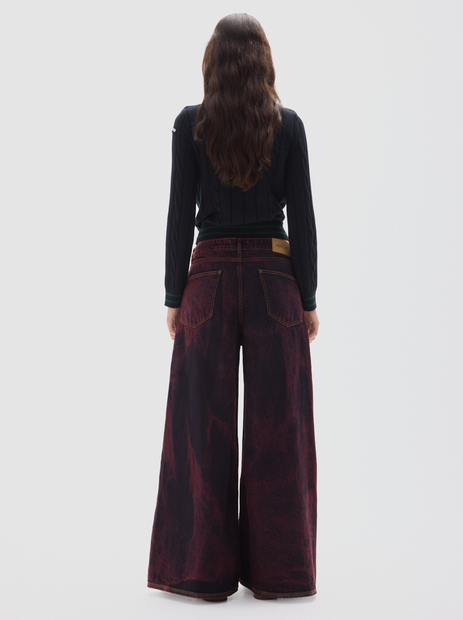 Jean wide leg con lavado washed bordeaux, cinco bolsillo, con detalles en hilos oro.