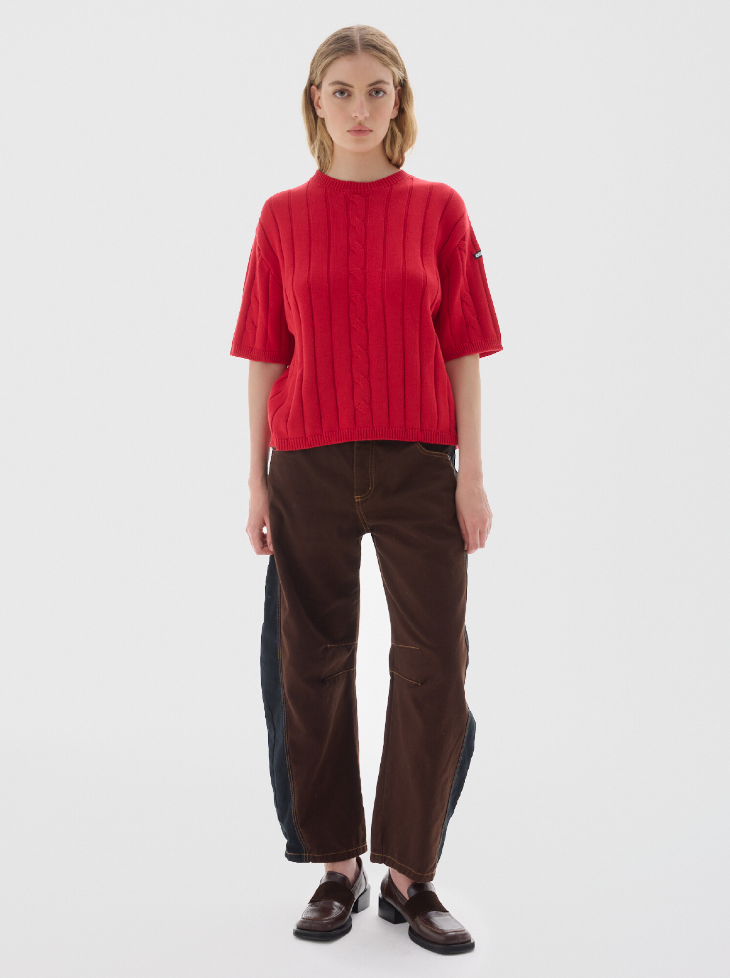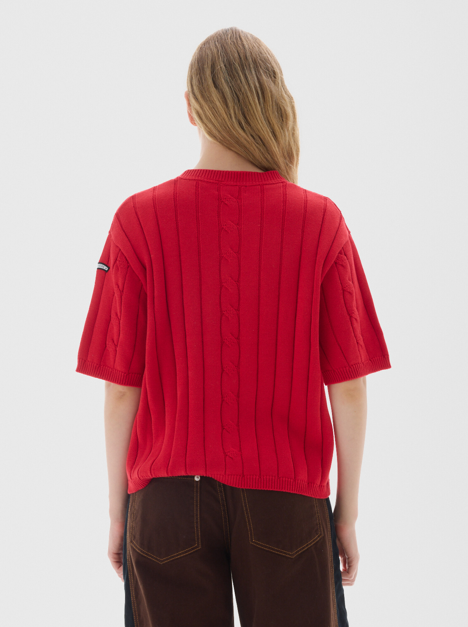 Buzo tejido de manga corta, cuello subido tipo polerita.