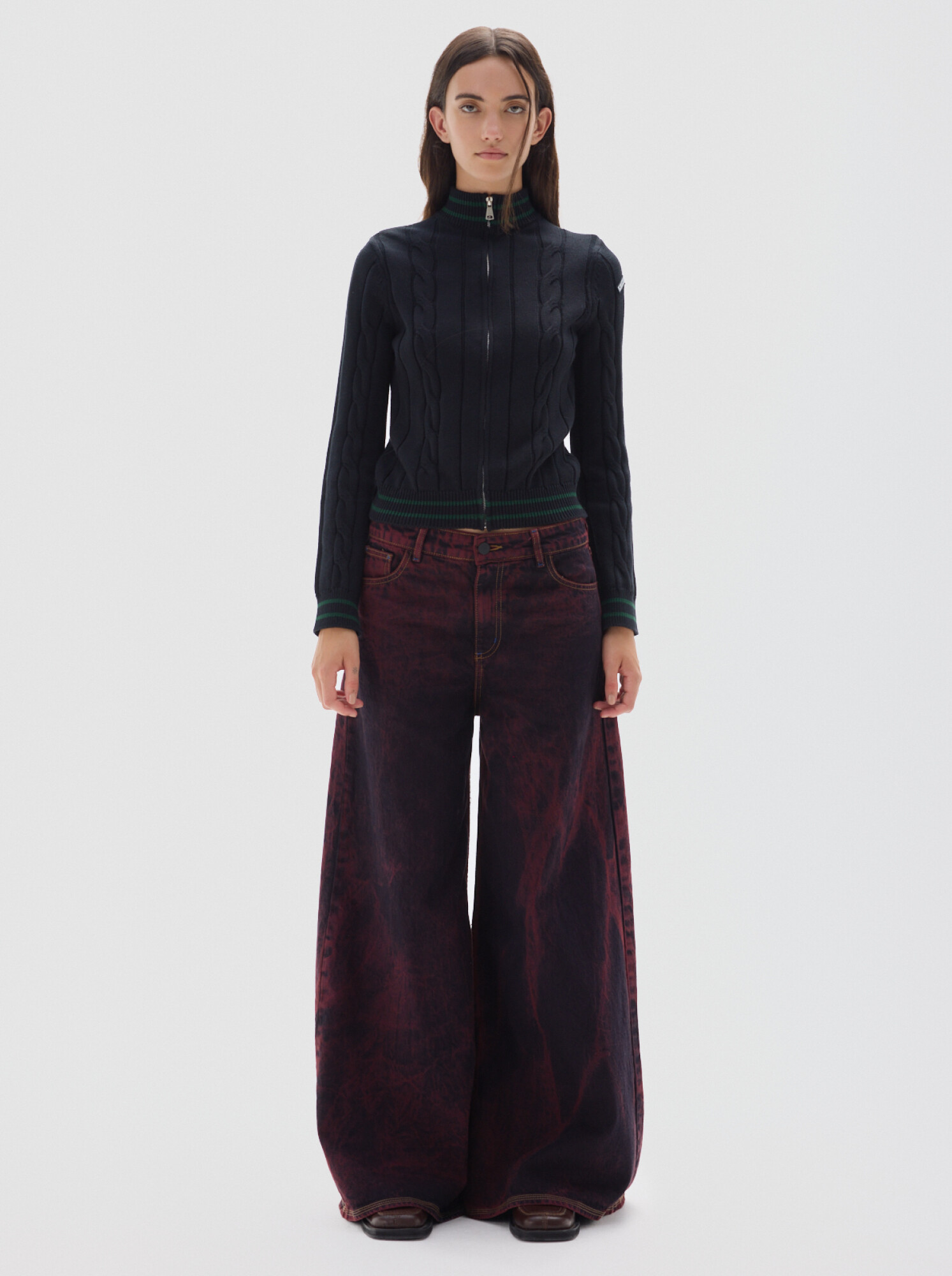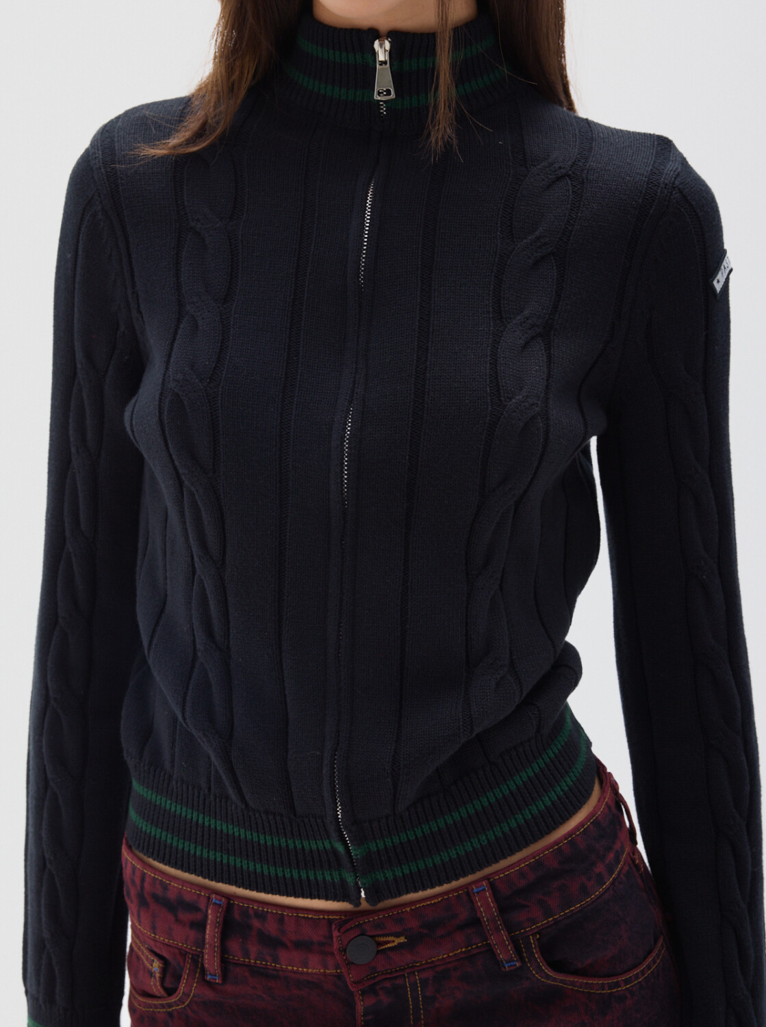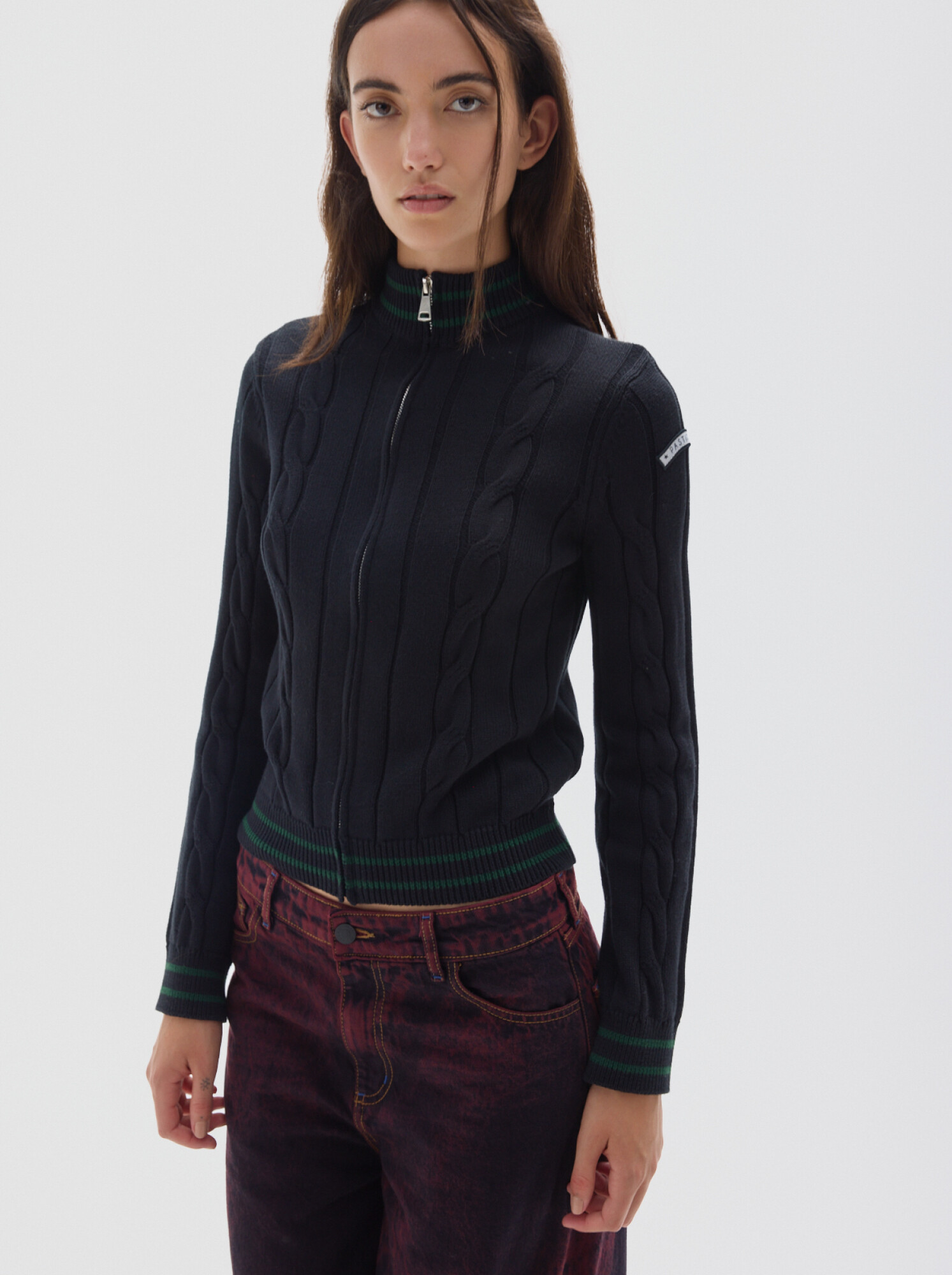 Tejido de ochos con cierre frontal, cuello alto y rayas en contratono en puños y cuello.