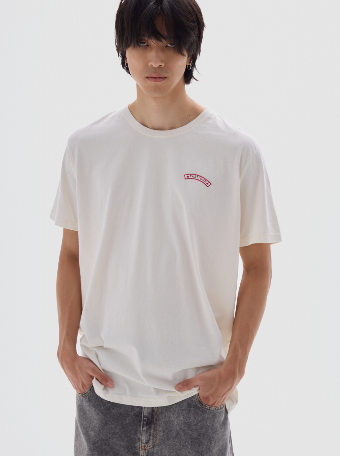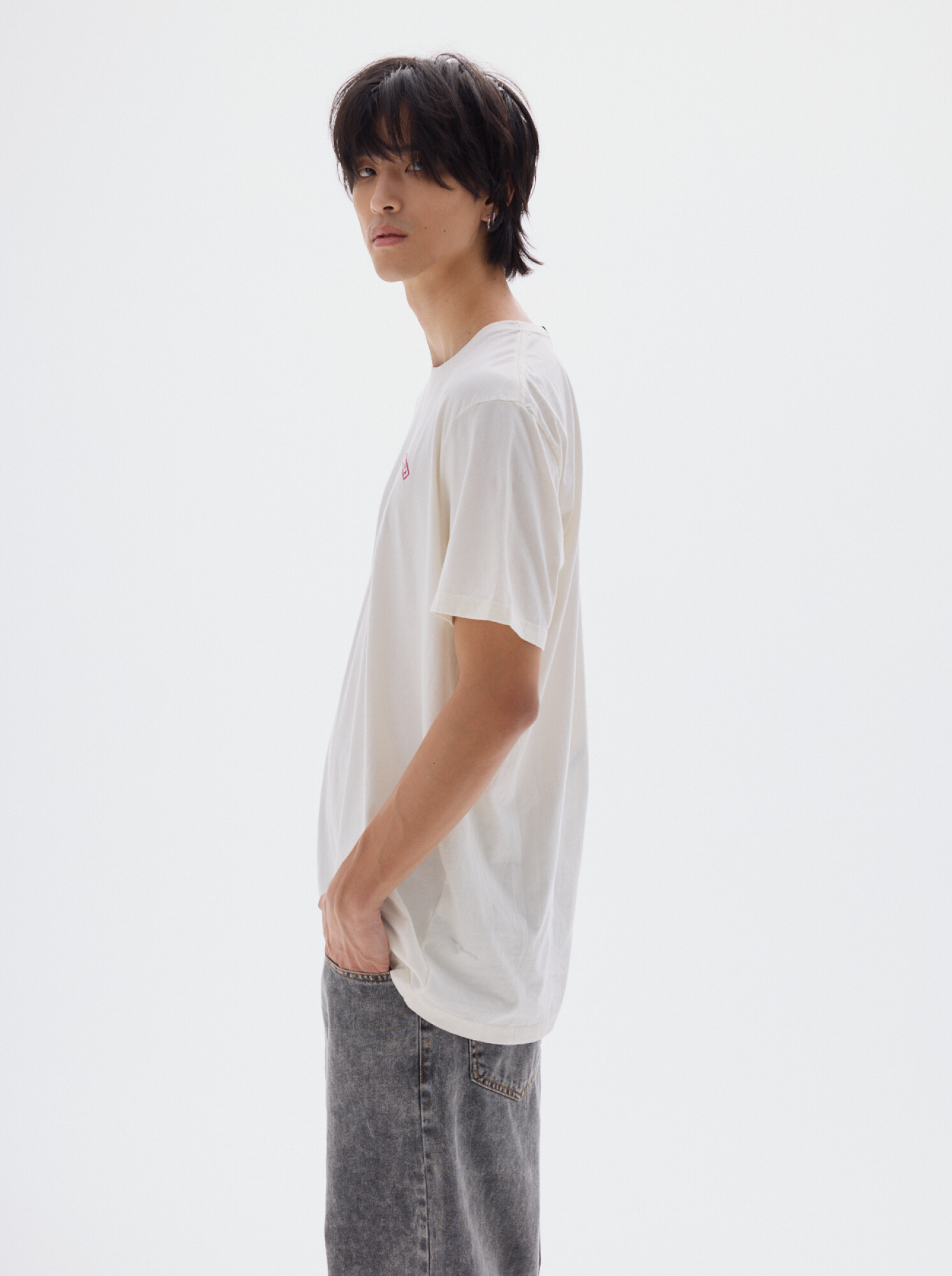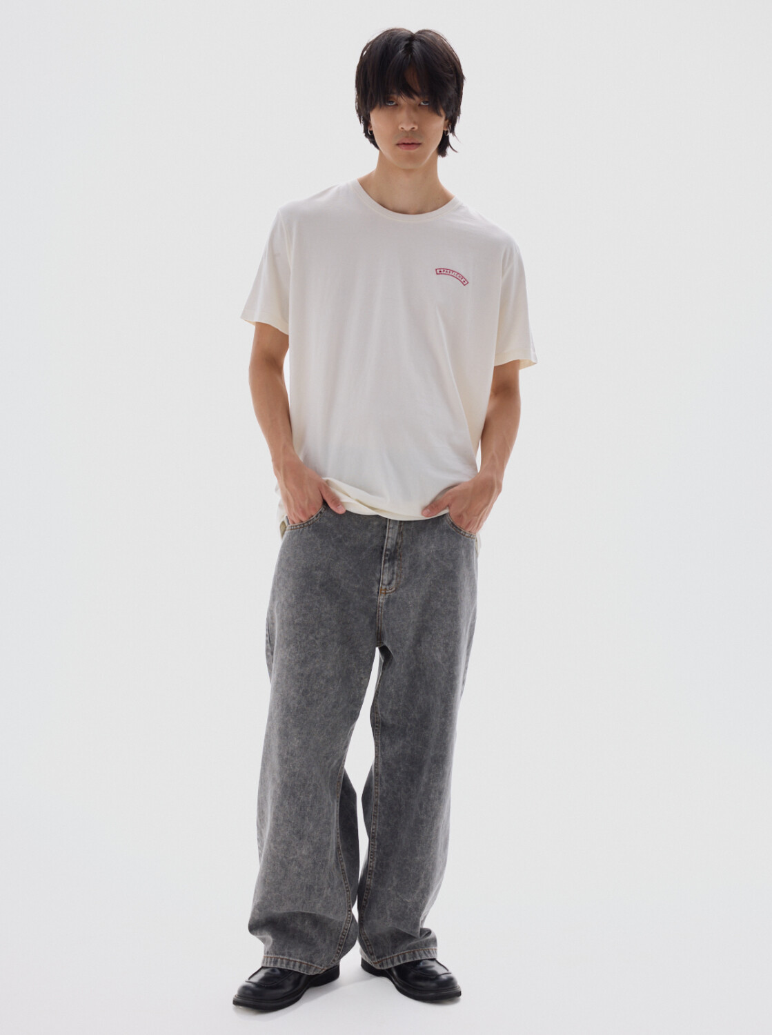 Remera cuello redondo y manga corta, fitting oversized, de algodón lavado que le da una textura única.