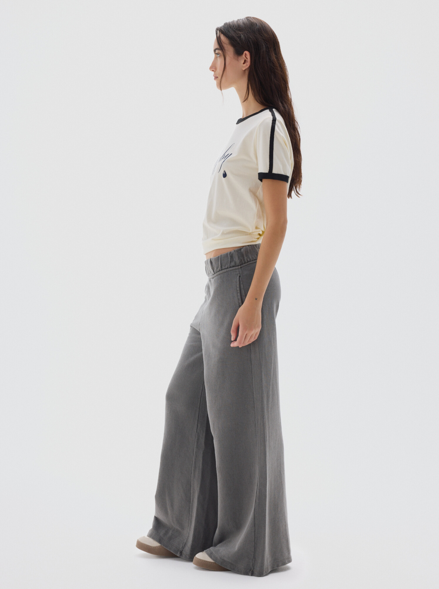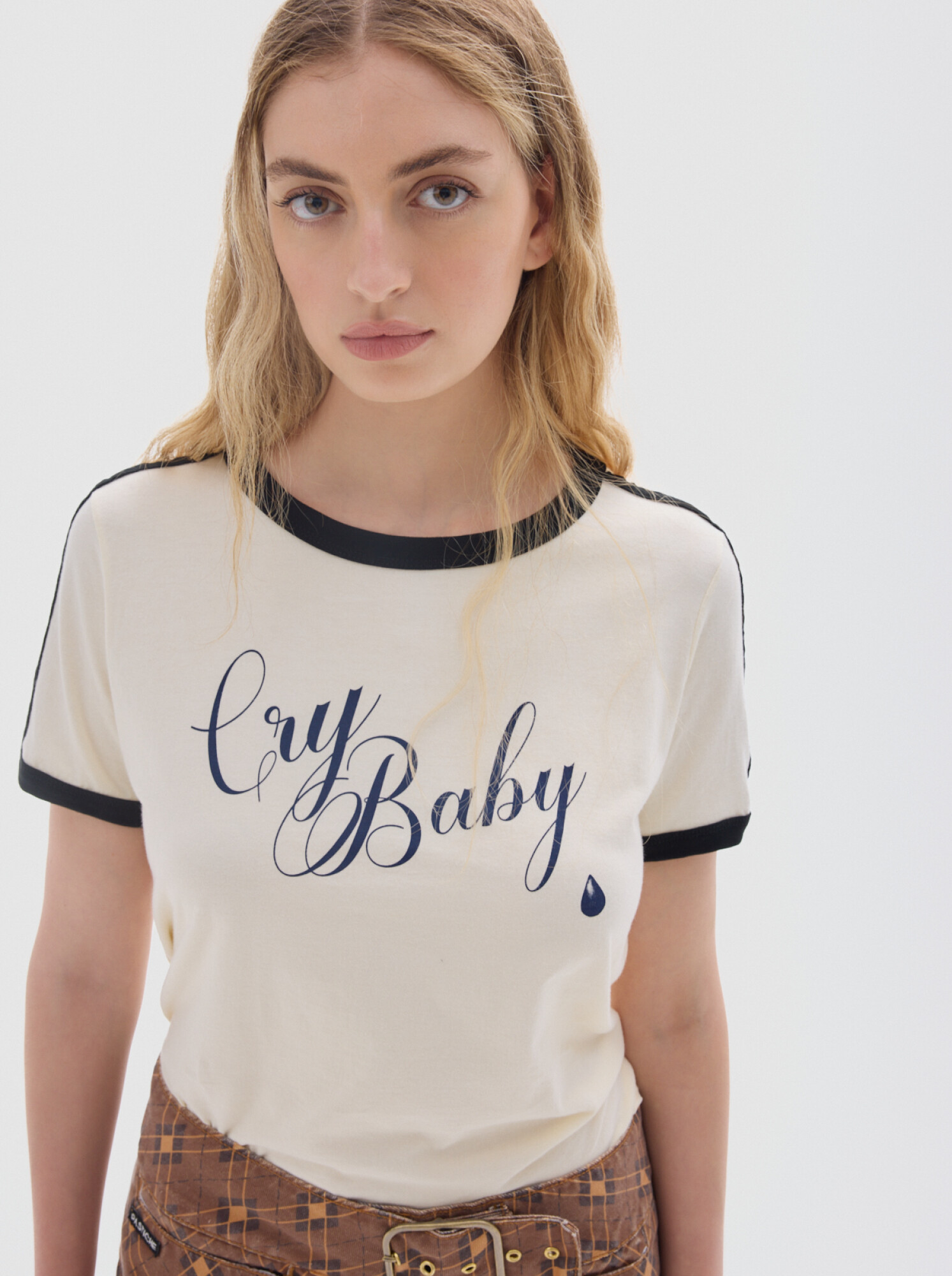 Silueta ajustada con aire noventoso y estampa central.