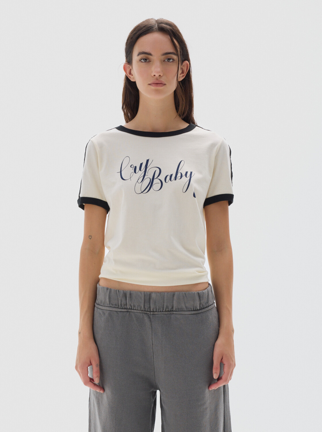 T-shirt de cotton, fit baby, cuello a la base y vivos en contratono en cuello y mangas.