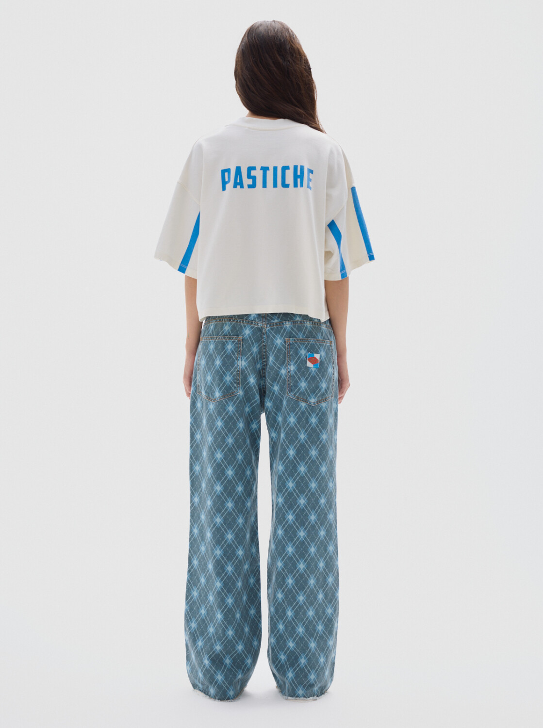 Cuello redondo y mangas corta a rayas verticales. Estampa en frente y espalda.