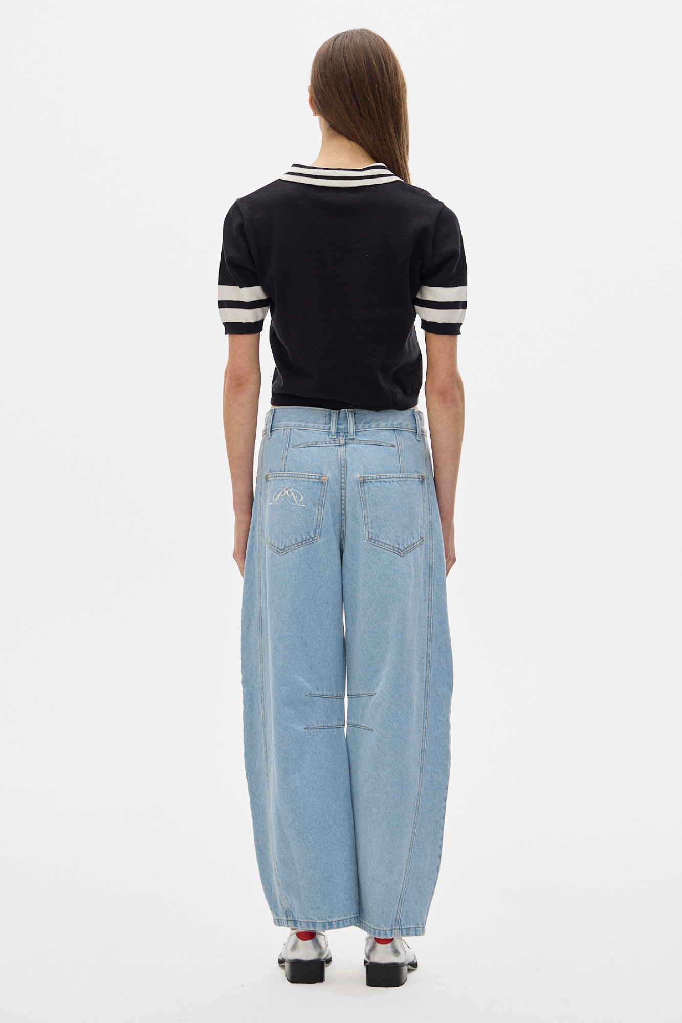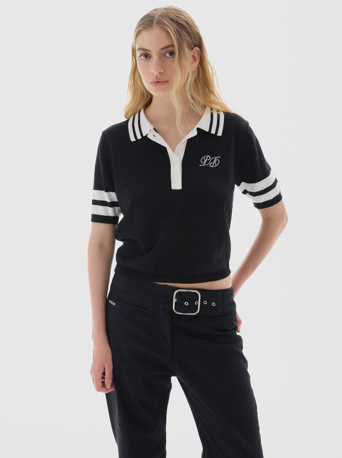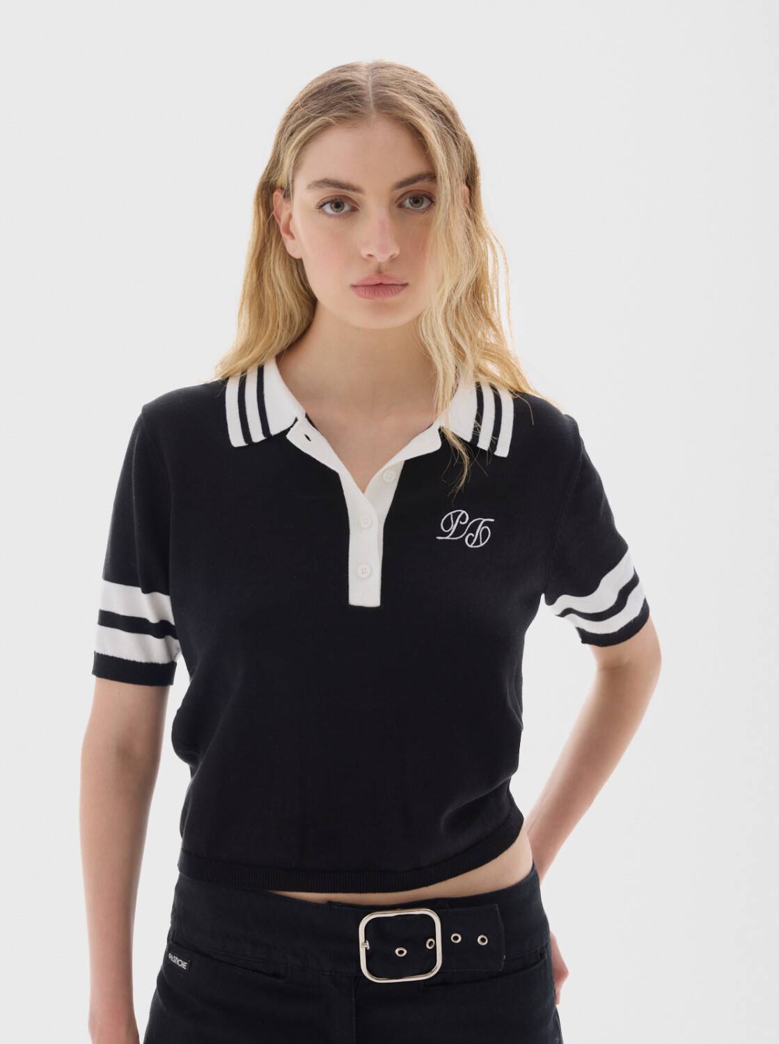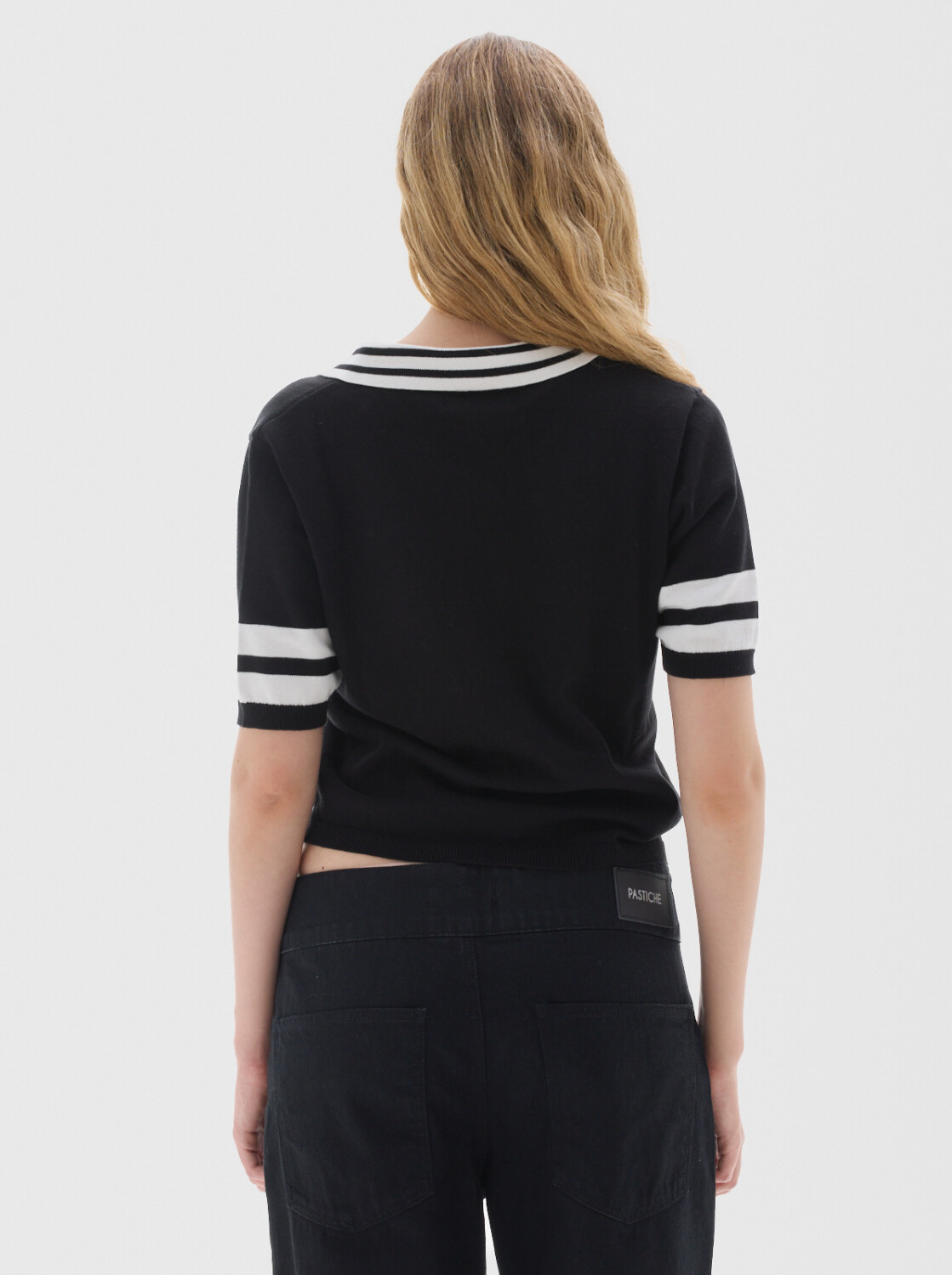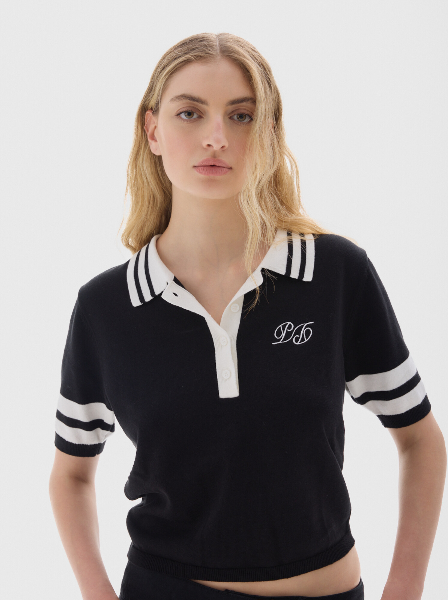 Remera tejida, tipo polo tejida, con cuello y botones.