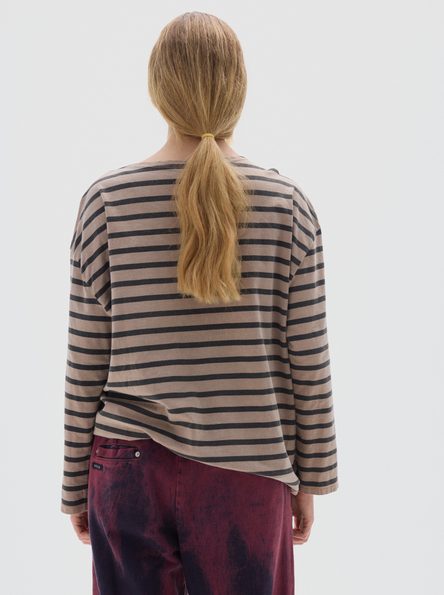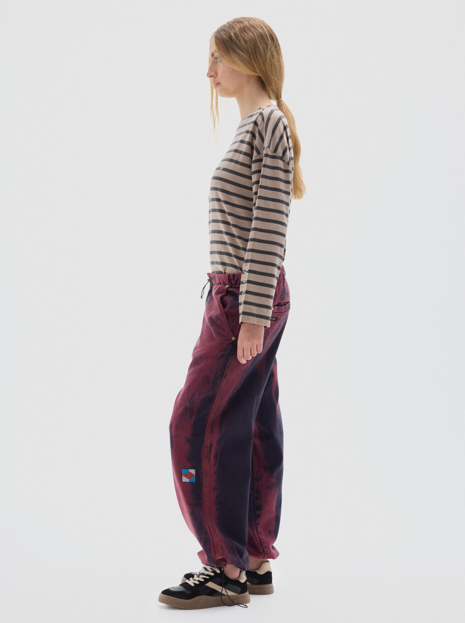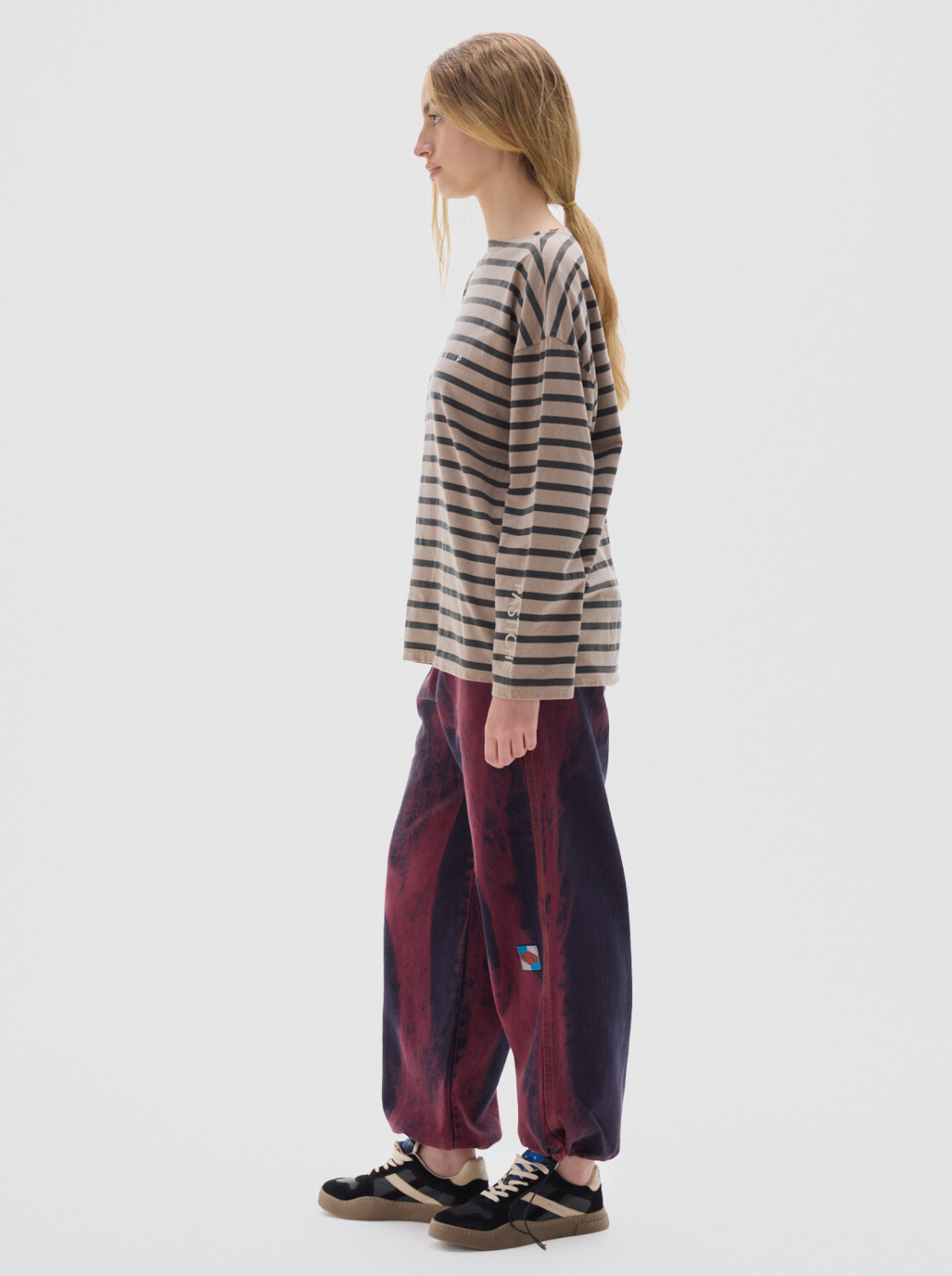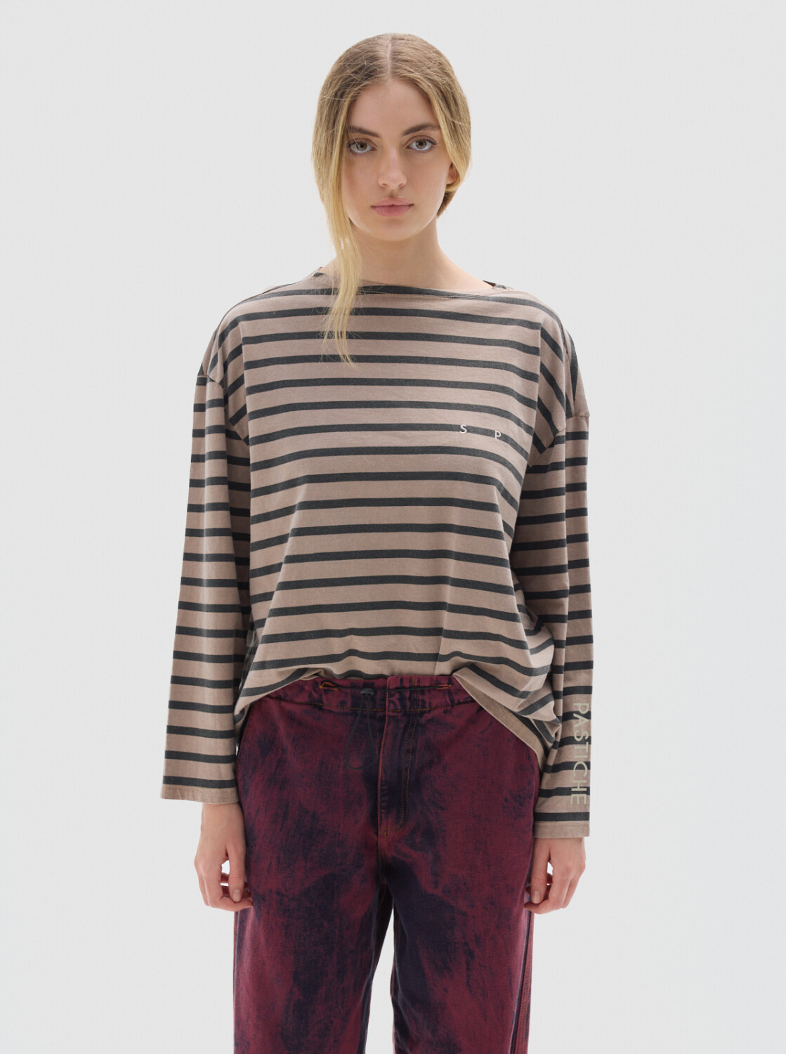 Detalle de bordado SP en el frente y estampa PASTICHE en la manga.