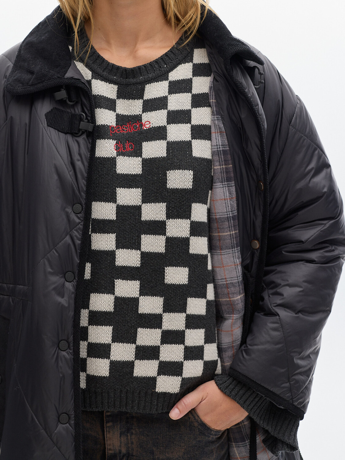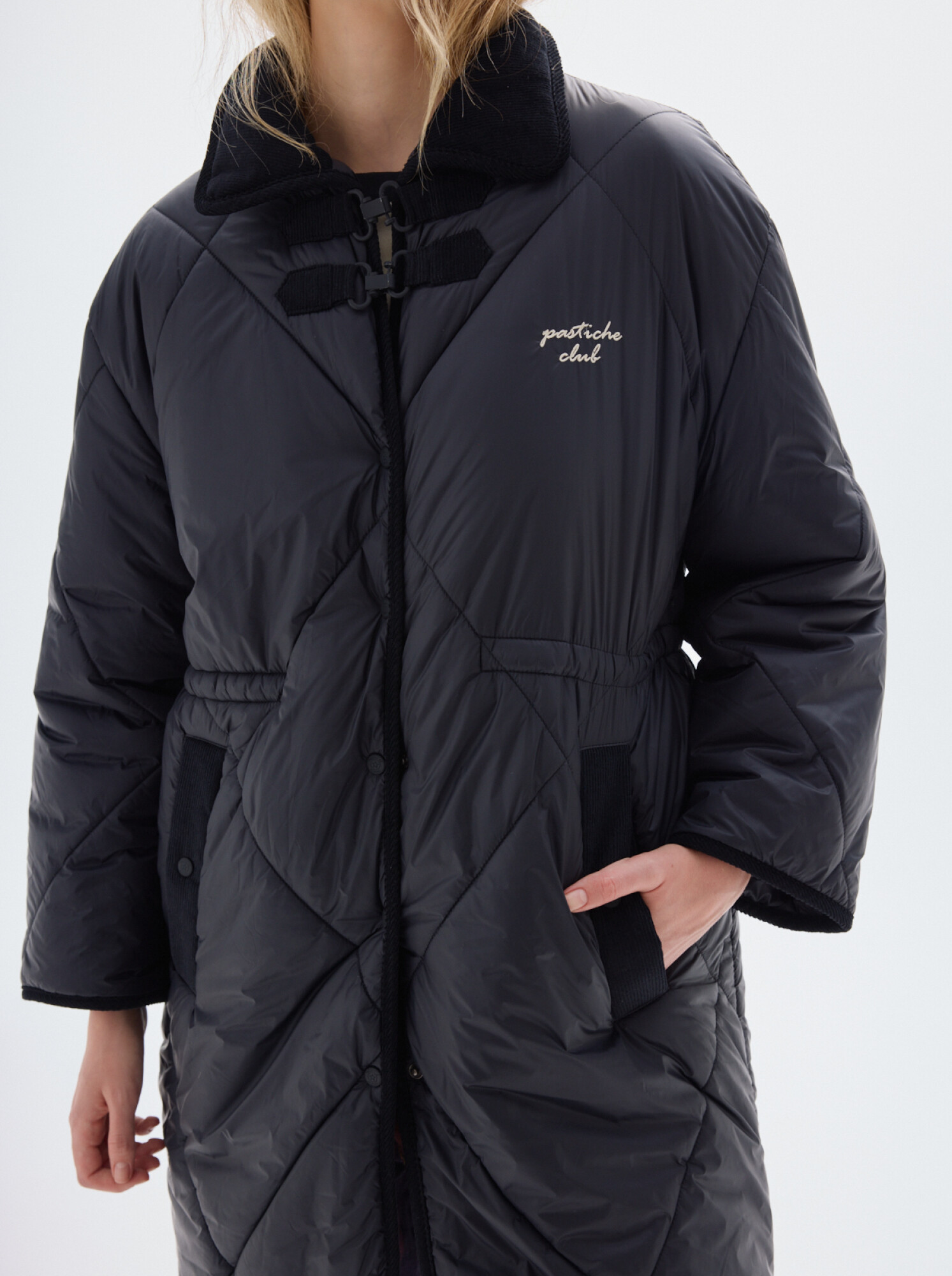 Tapado largo hasta las rodillas, combinado en pana en cuello y bolsillos.