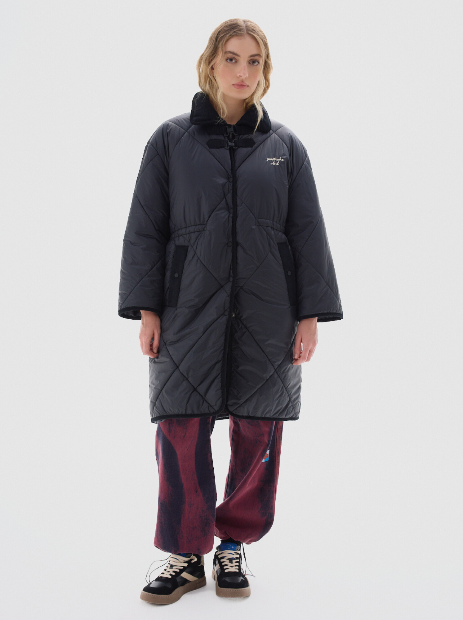 Bolsillos delanteros y cierre frontal con botones a presión. Cordón en la cintura para ceñir a gusto.