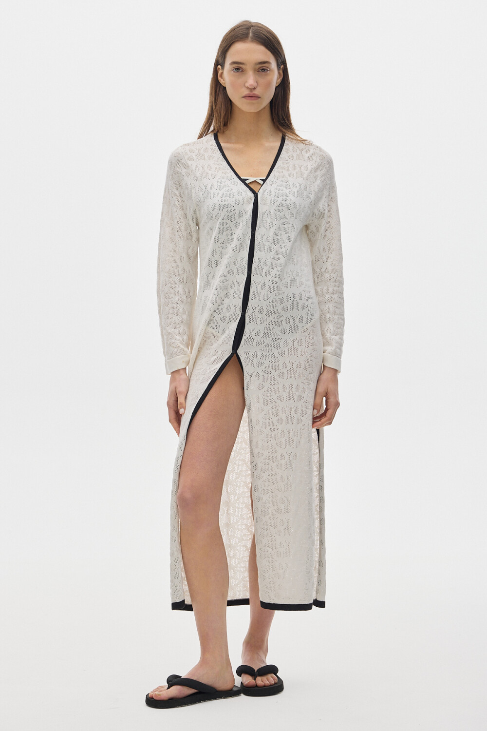 Túnica tipo vestido tejido calado, abotonado adelante.